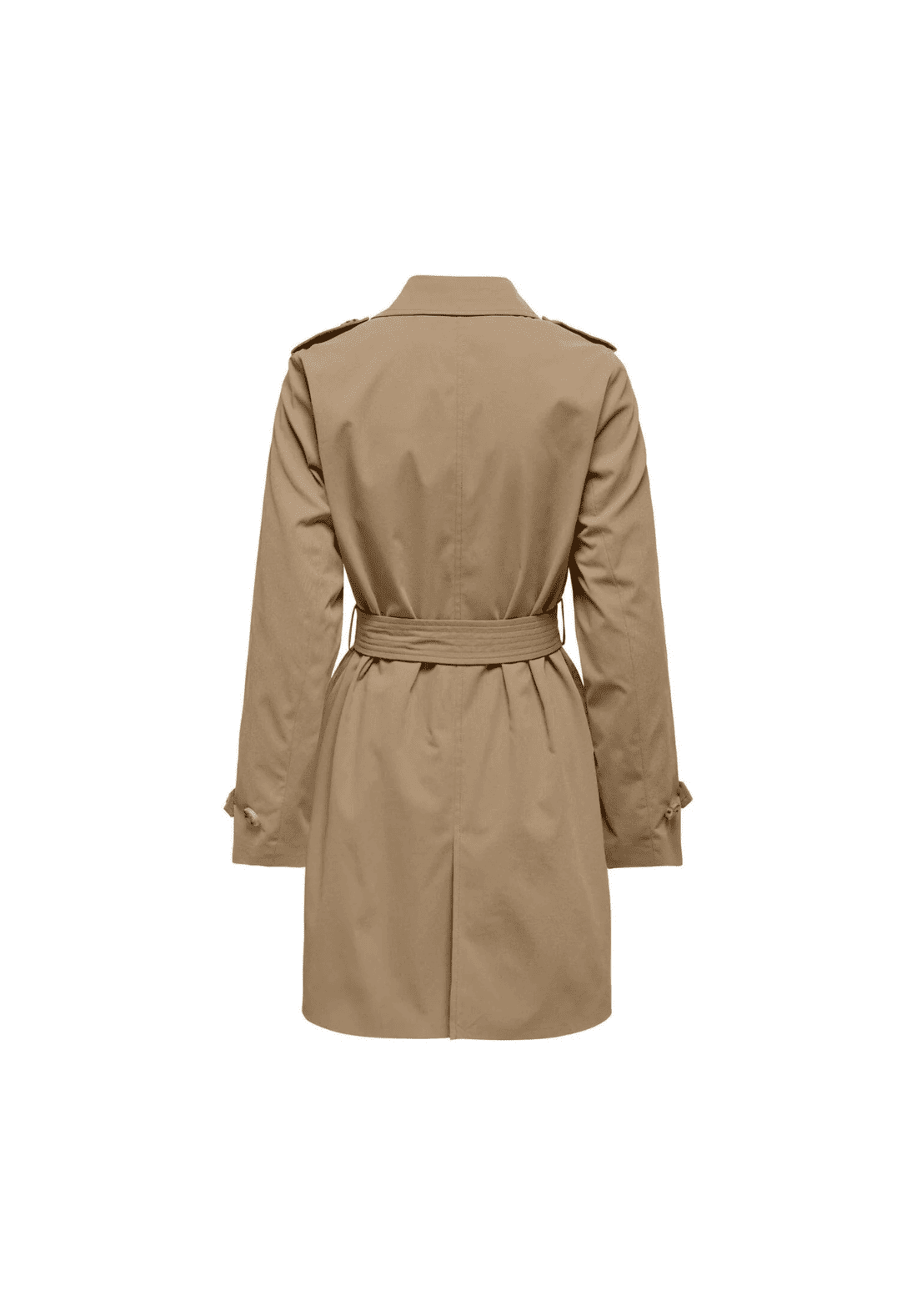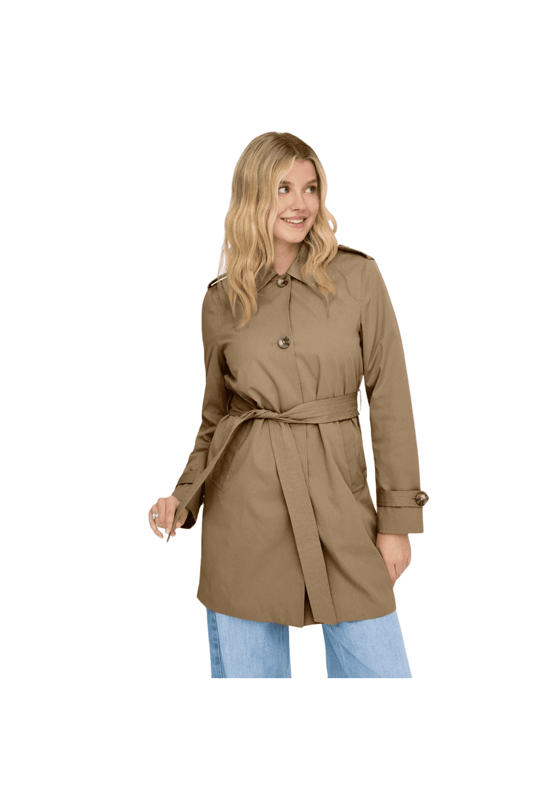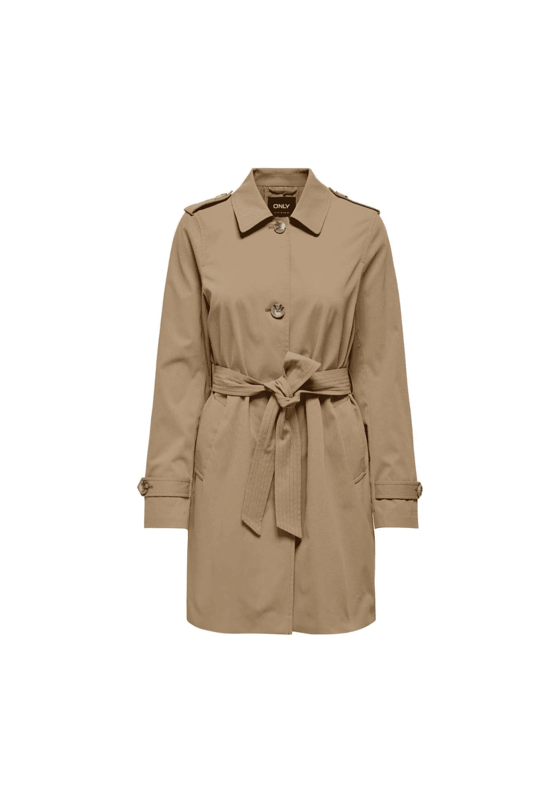 Gabardina de cuello invertido, con cierre de botones y cinturón en la cintura.
