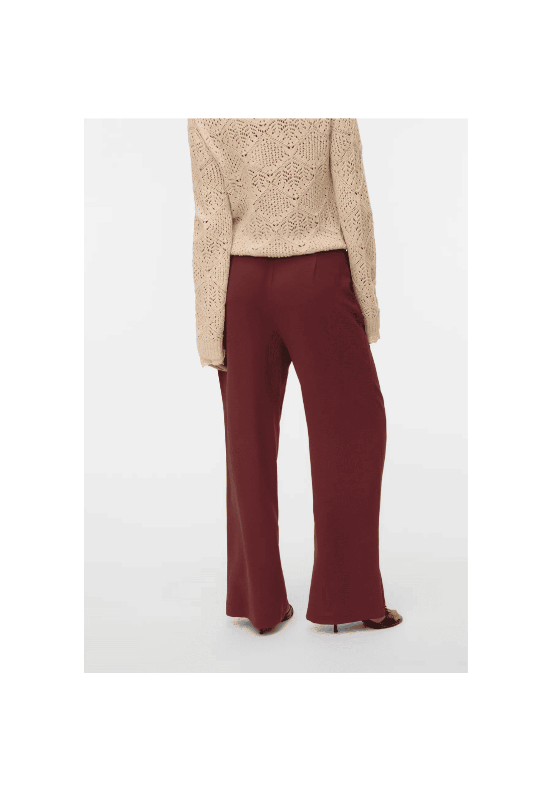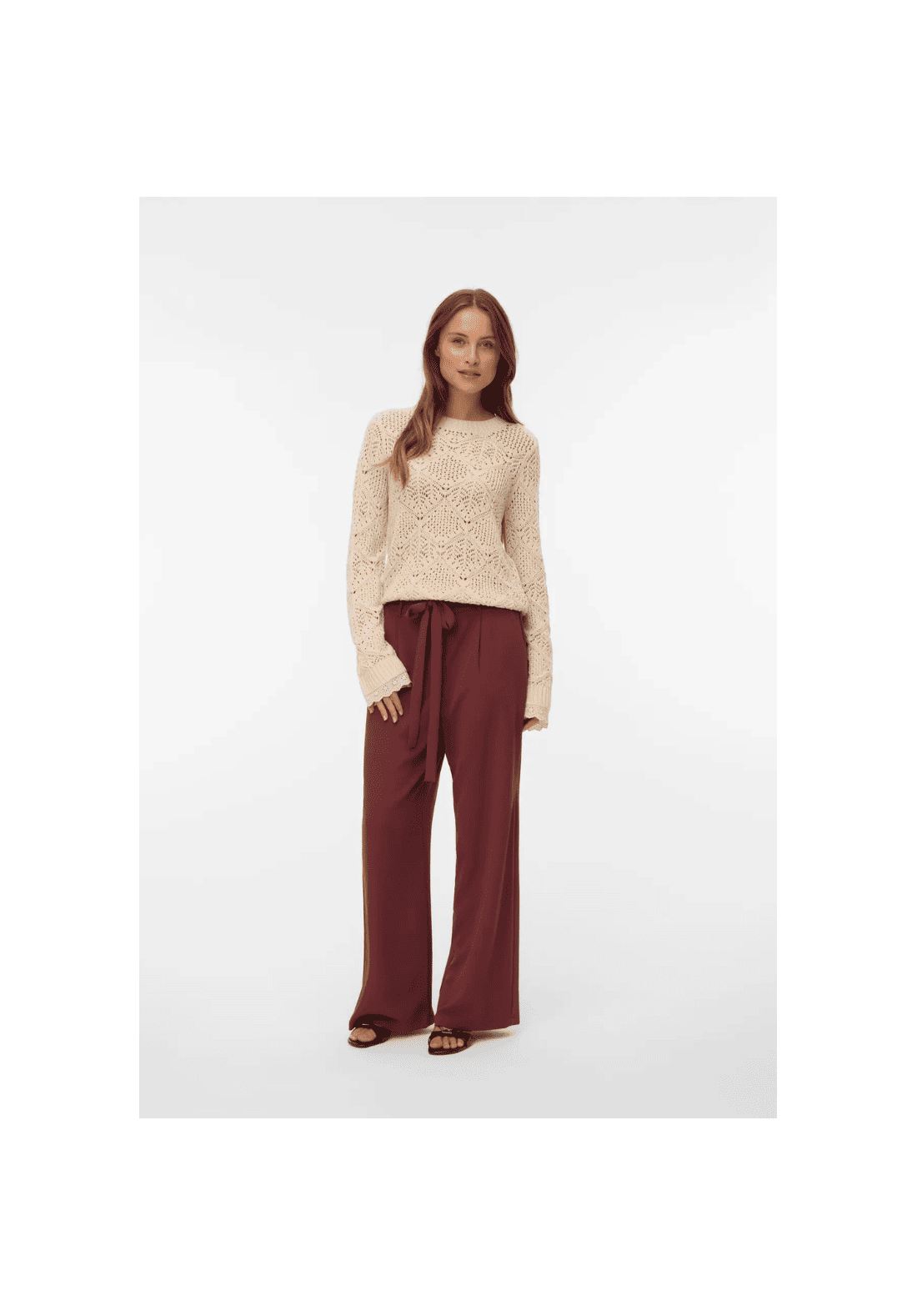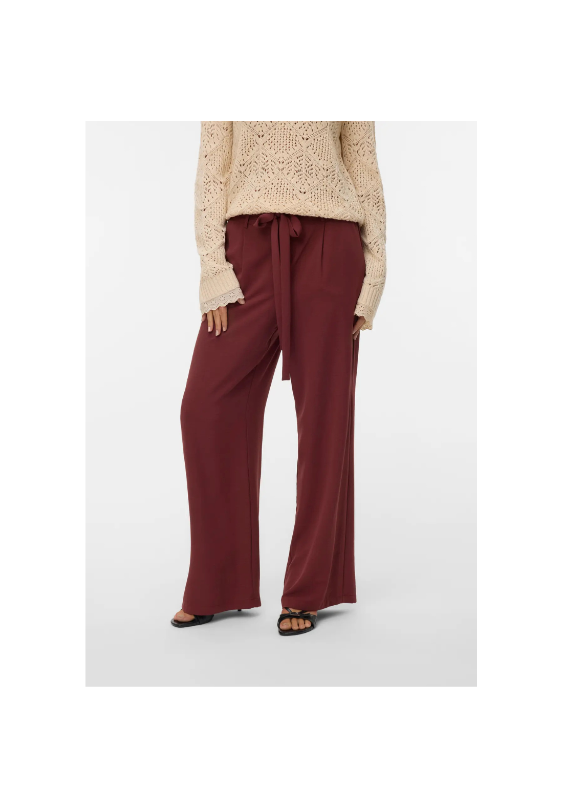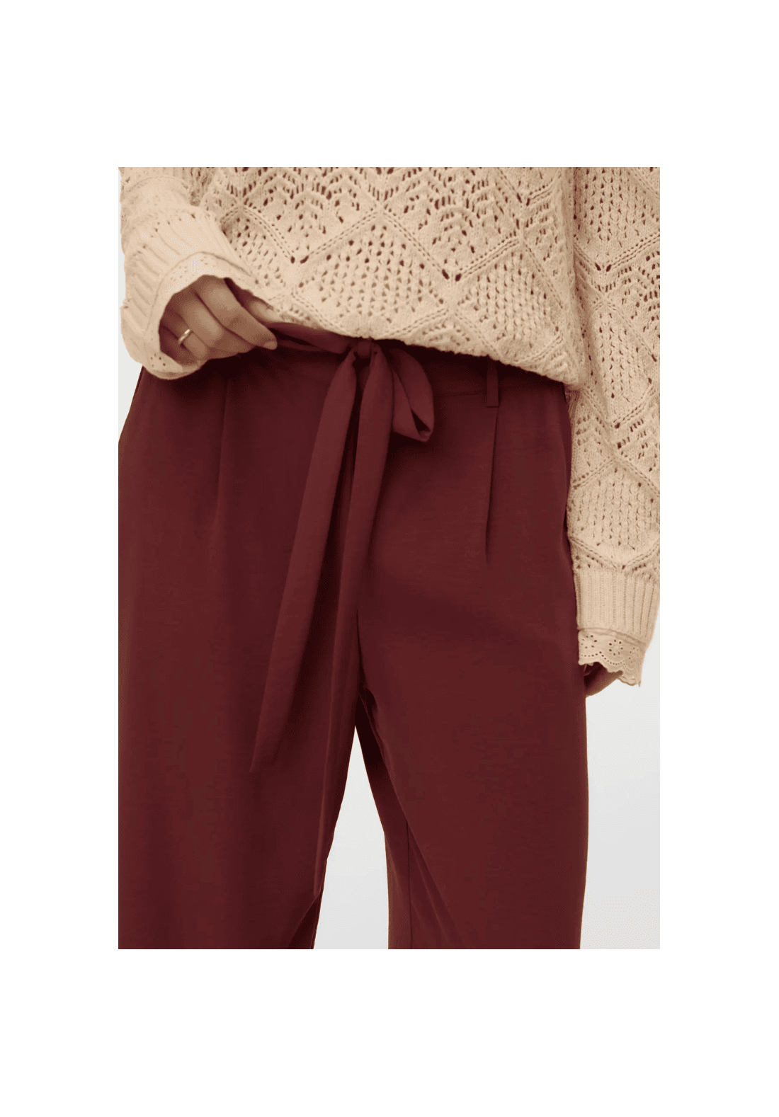 Pantalones anchos, de tiro medio, con cinturón y bolsillos laterales.
