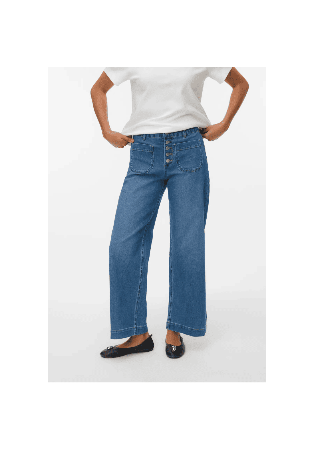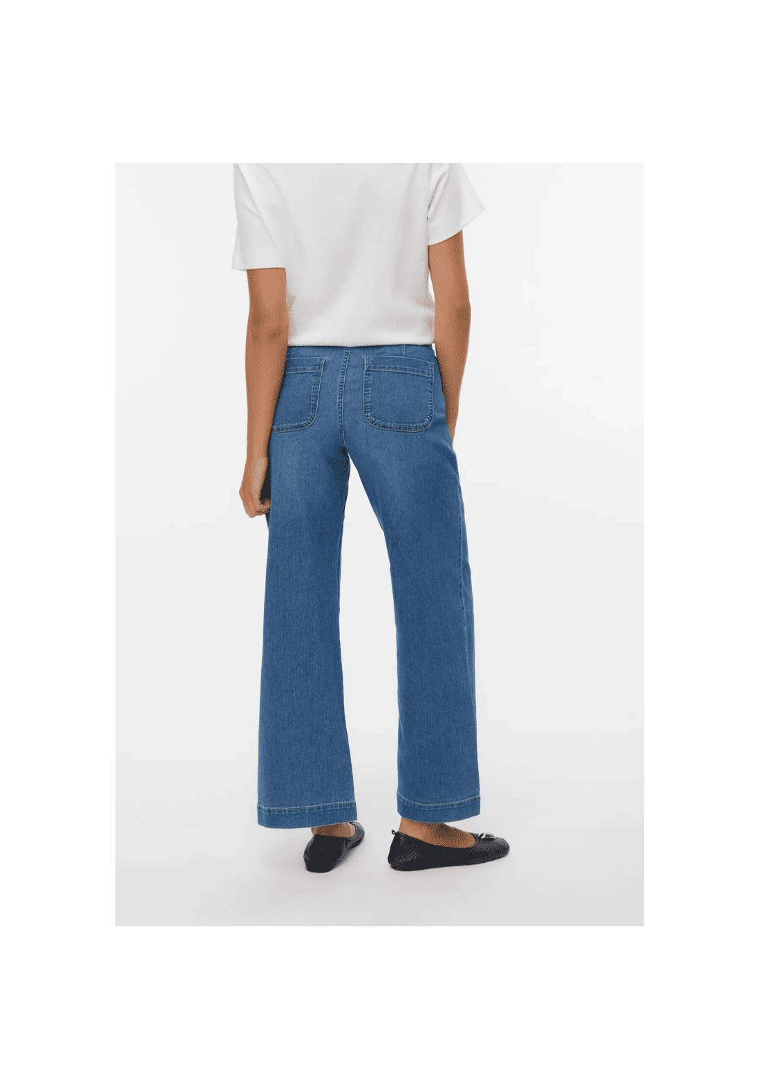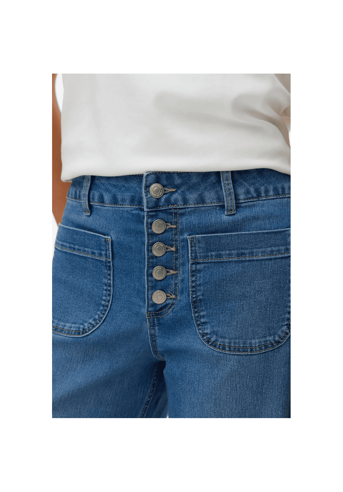 Pantalones vaqueros de tiro alto, con cierre frontal de botones. Bolsillos delanteros y traseros.