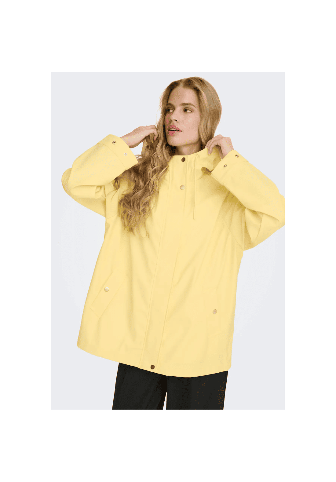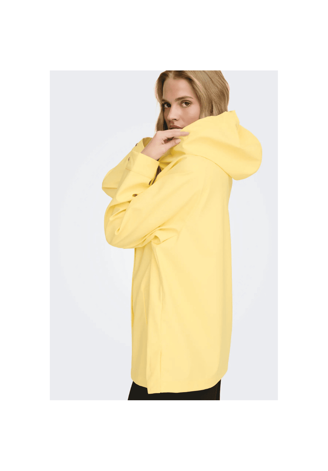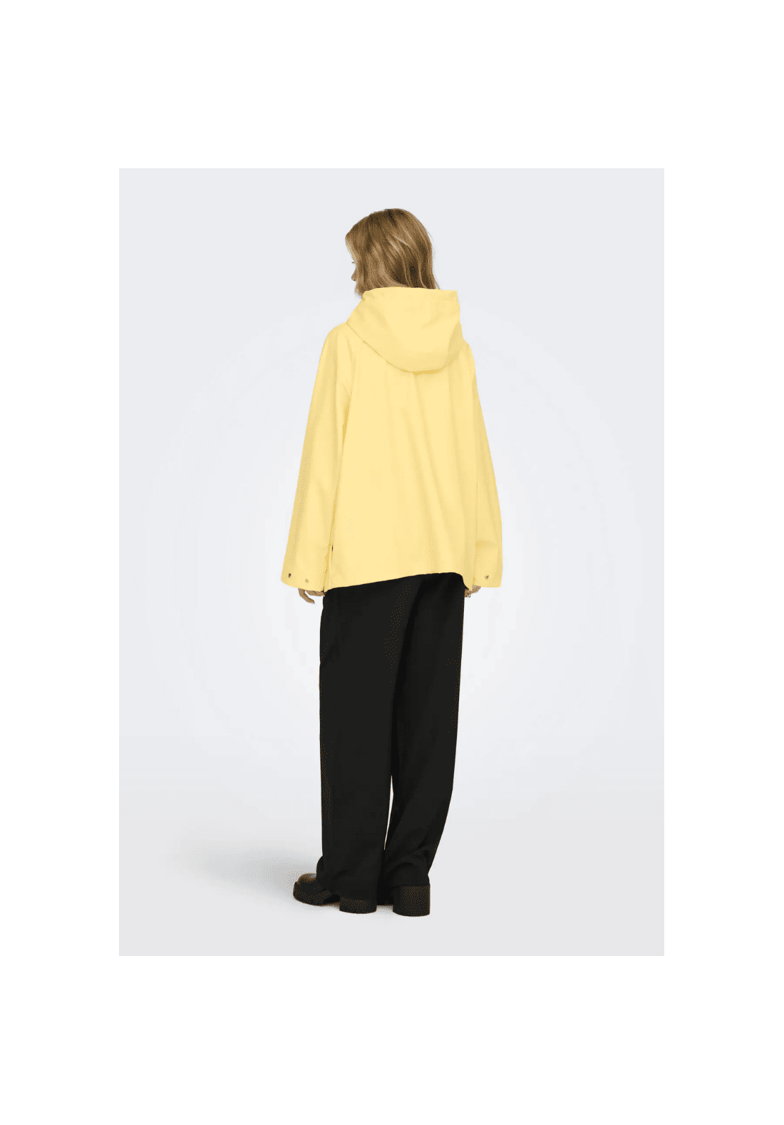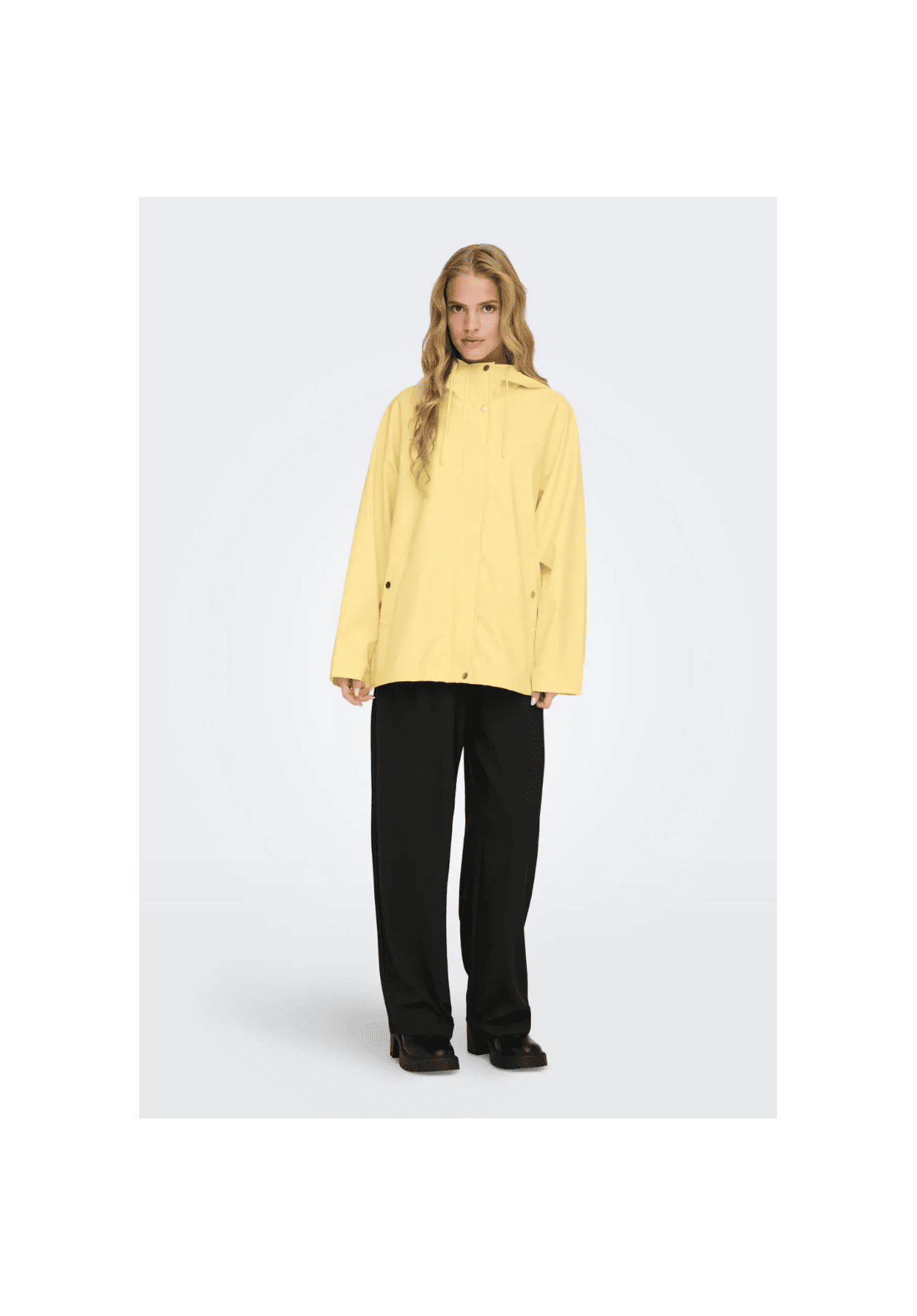 Chaqueta impermeable con capucha y cordón fijo. Cierre frontal de cremallera.