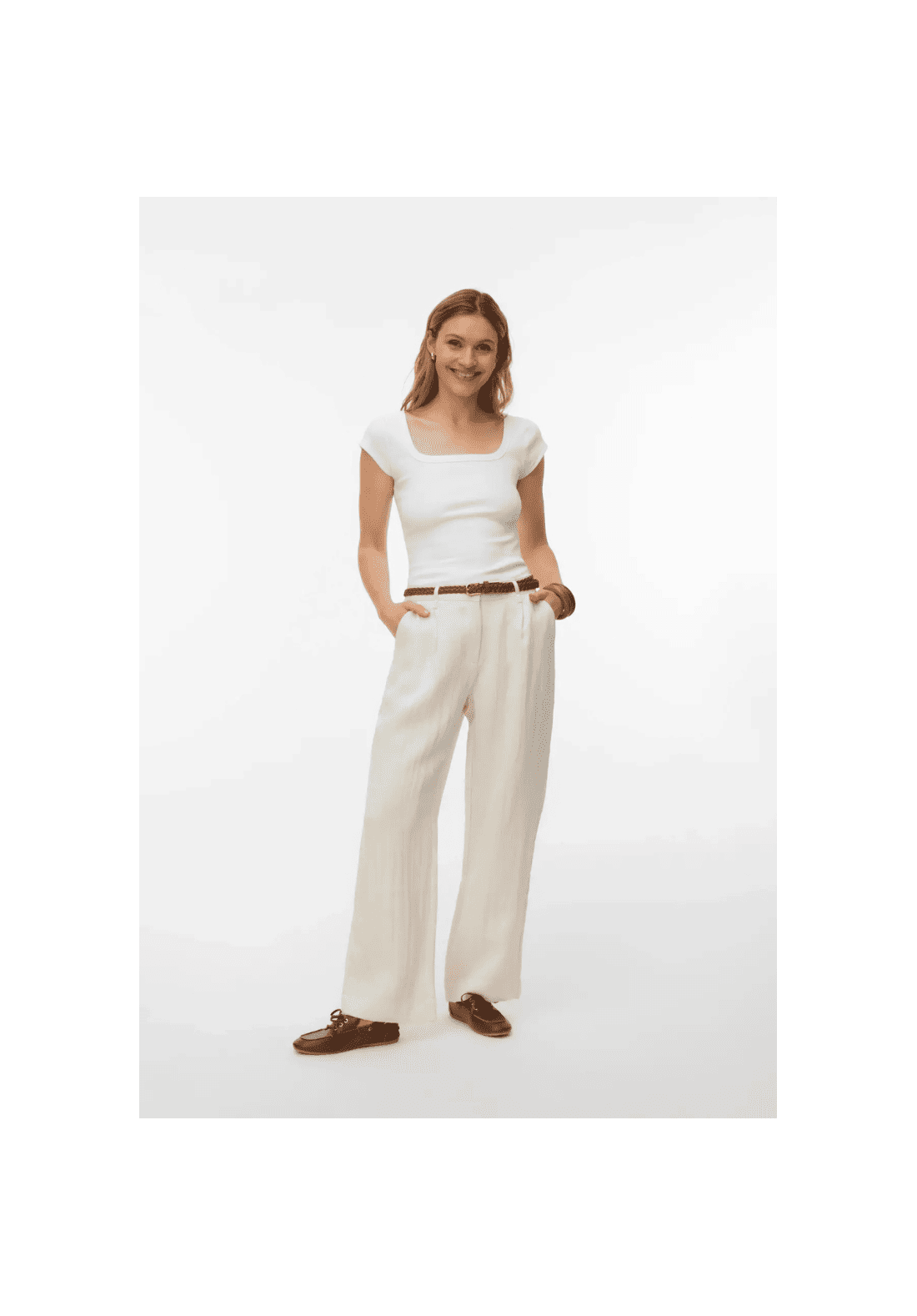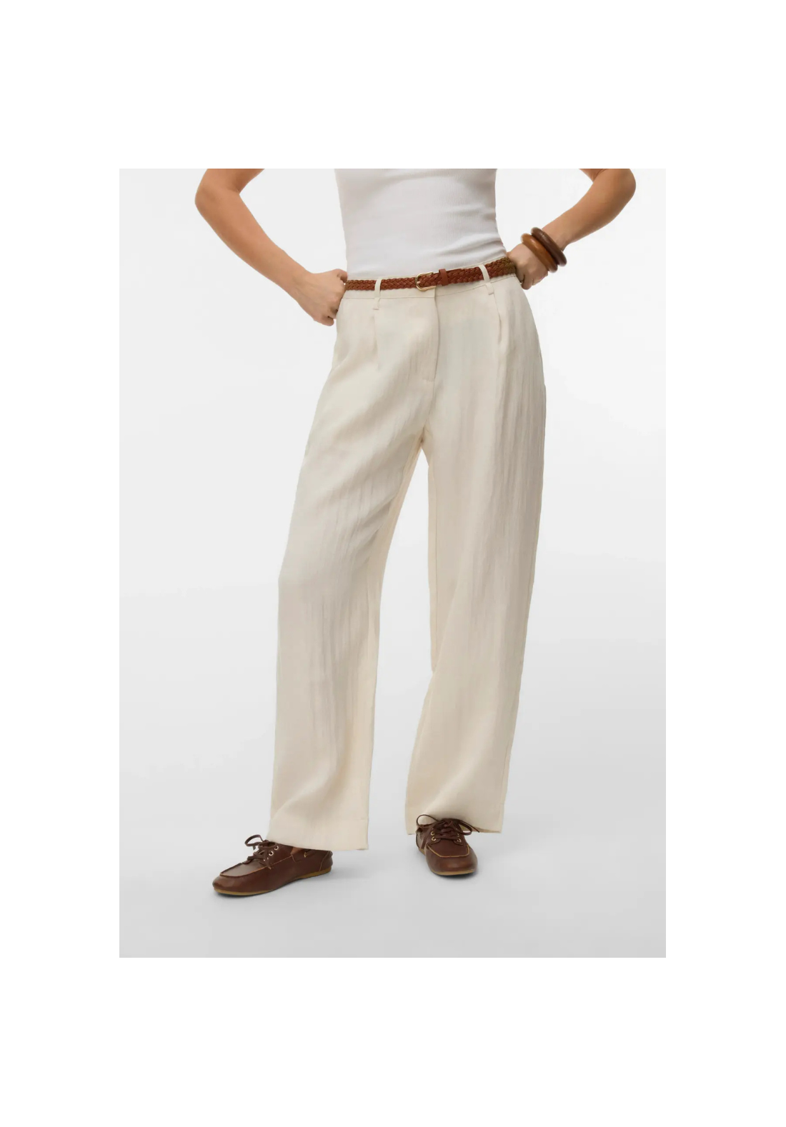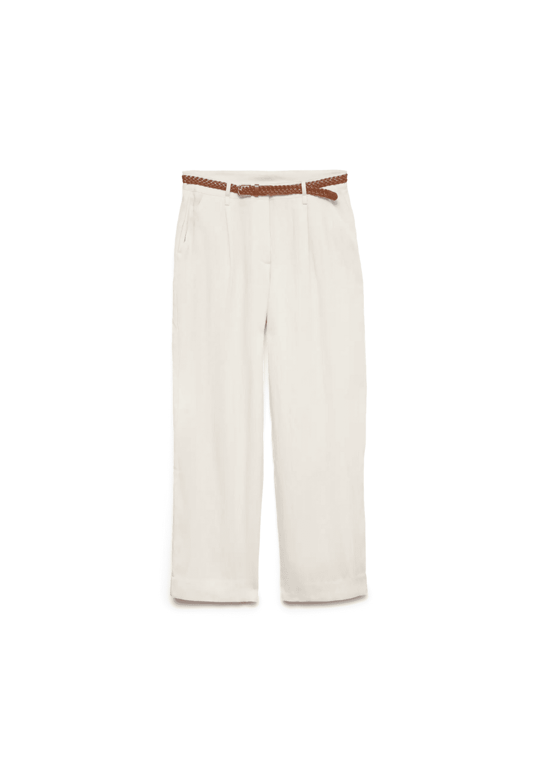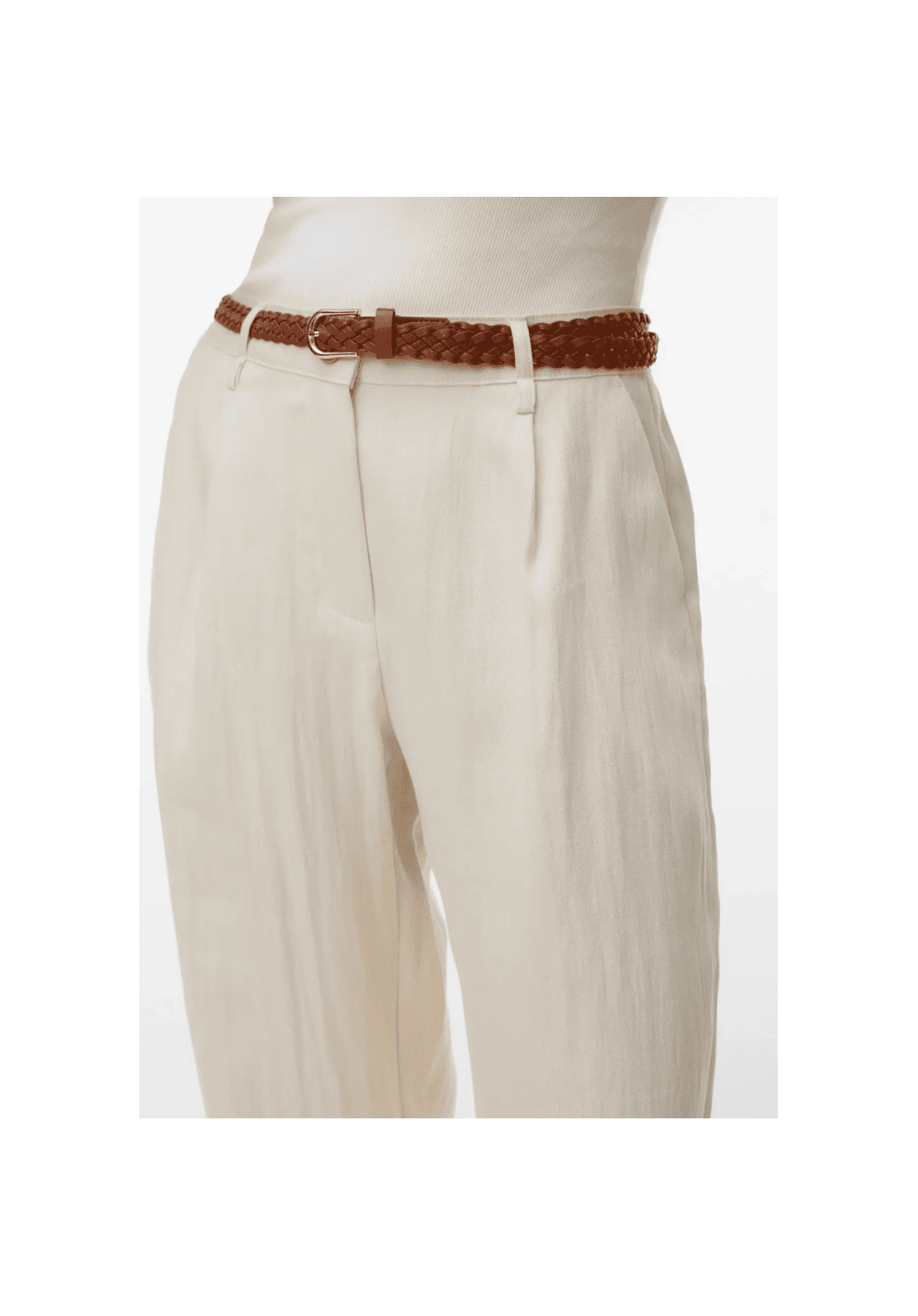 Pantalones de talle medio, con cierre de botón y cremallera. Tiene bolsillos laterales. Trae cinturón.