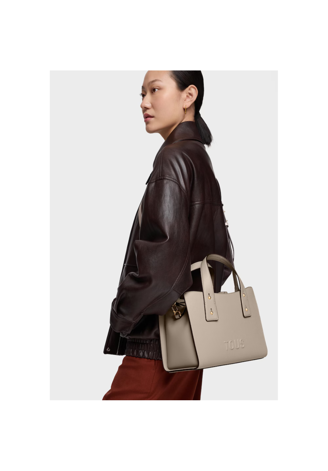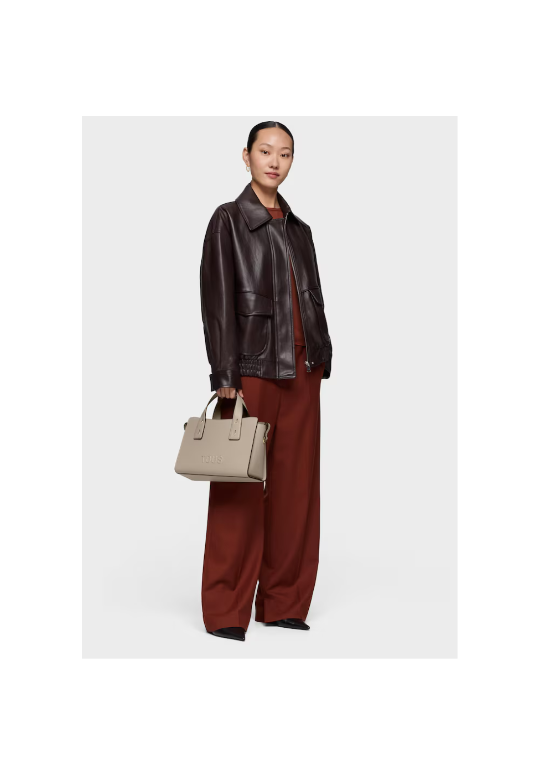 Bolso city mediano Back to basics de poliuretano con cierre con mosquetón central. Bolsillo interior con cremallera. Asa fija de hombro.