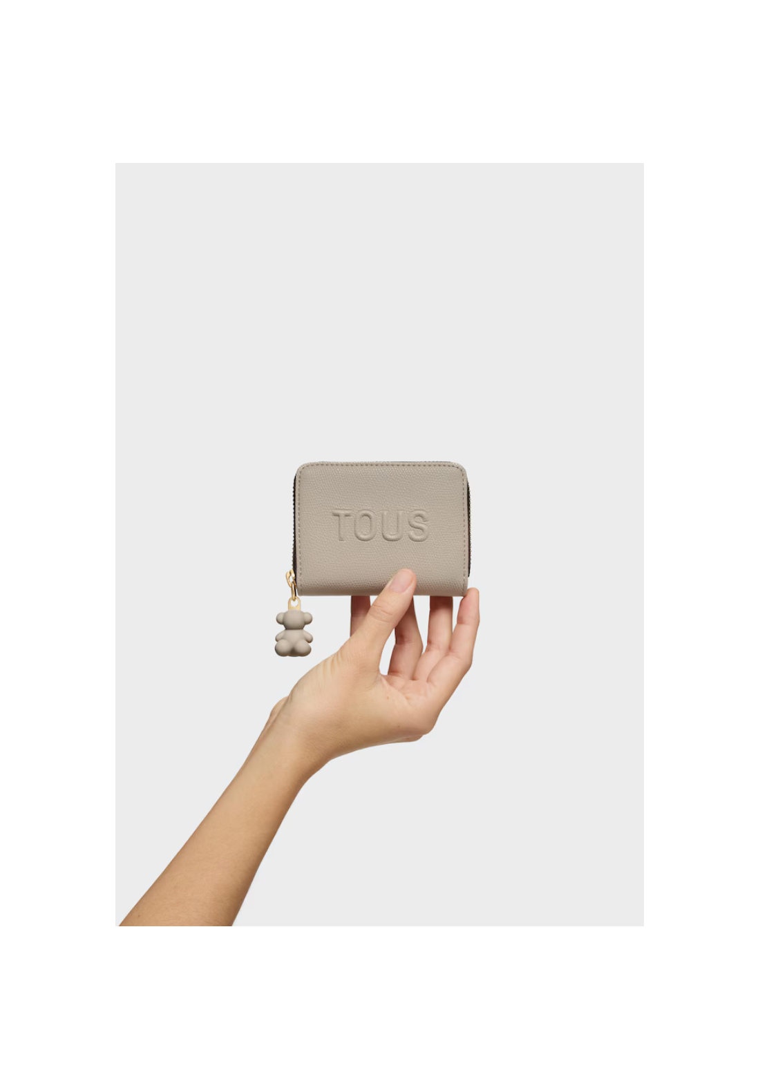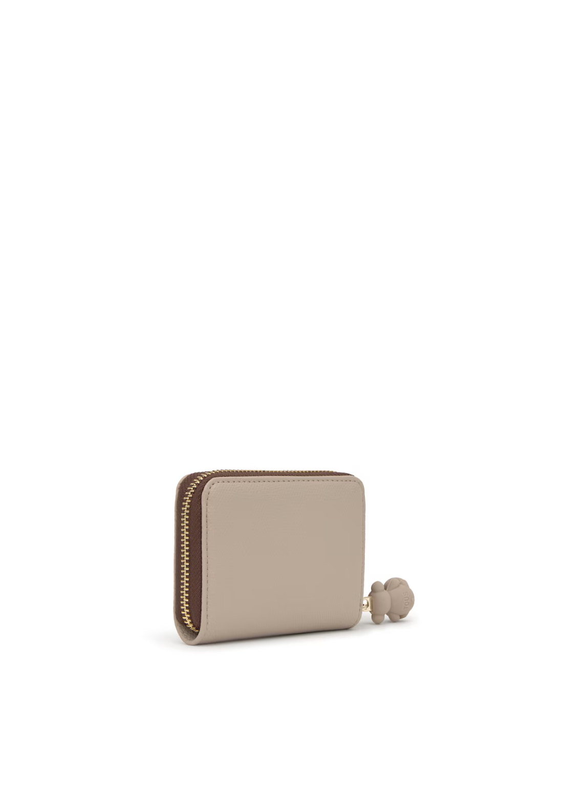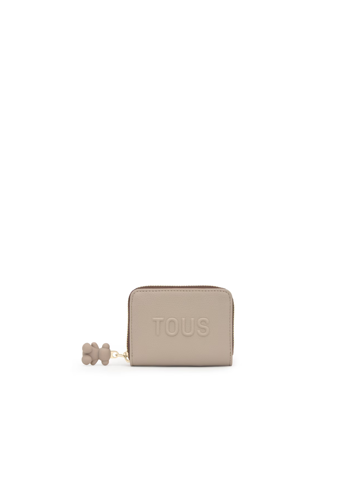 Monedero TOUS Back to Basics de poliuretano con cierre de cremallera. En el interior contiene dos ranuras para tarjetas y tres compartimentos para monedas y billetes. Medidas (alto x ancho x fondo): 8 x 11 x 2 cm.