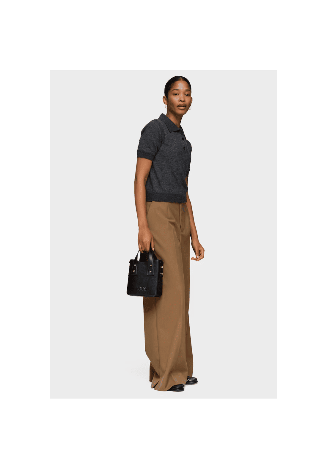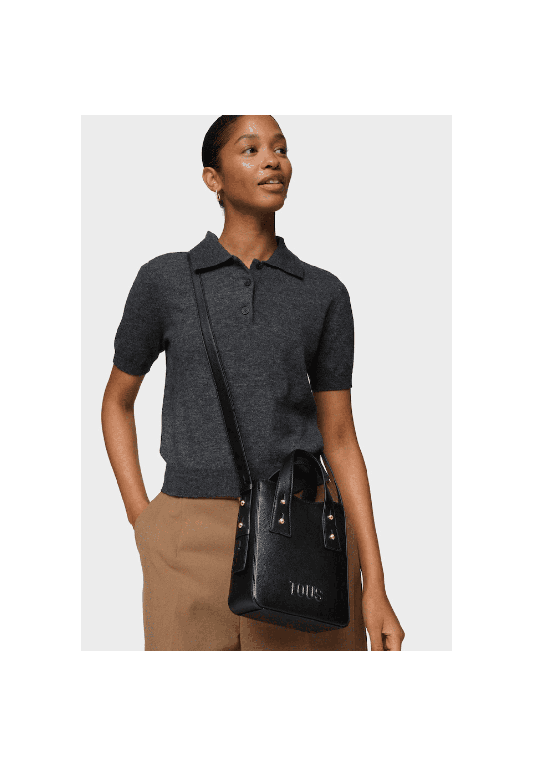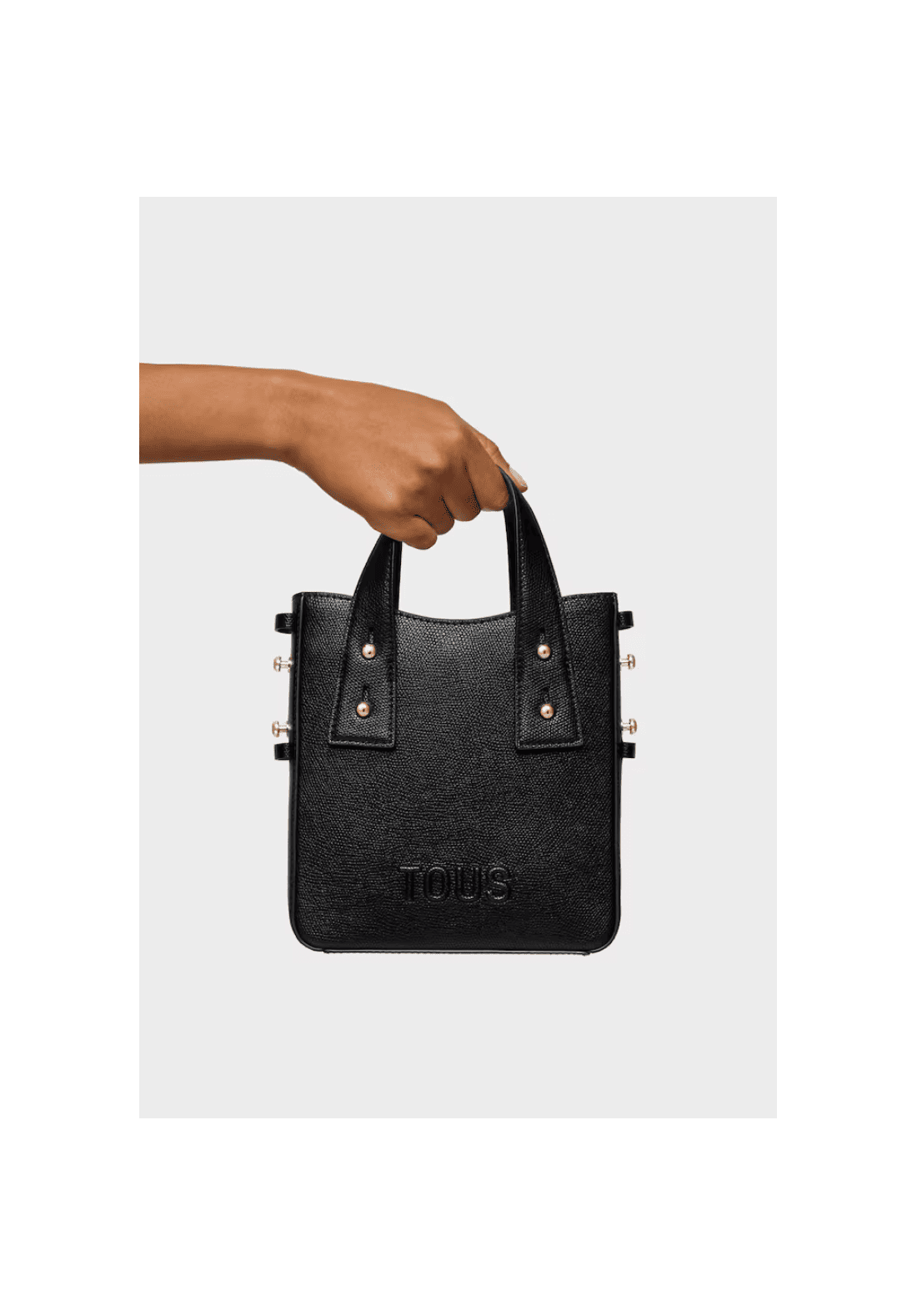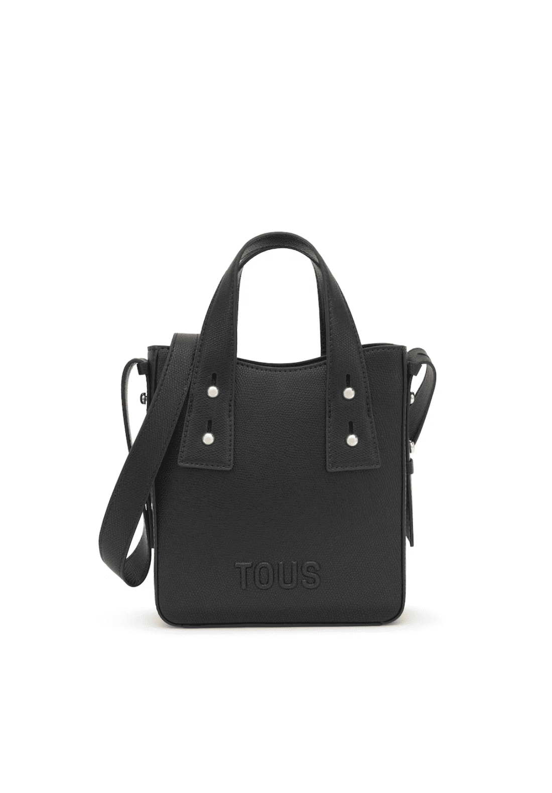 Minibolso TOUS Back to basics de poliuretano con cierre con botón magnético. Asas fijas de mano y asa bandolera ajustable y desmontable.