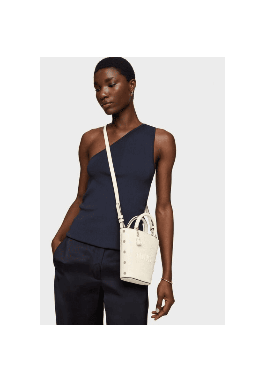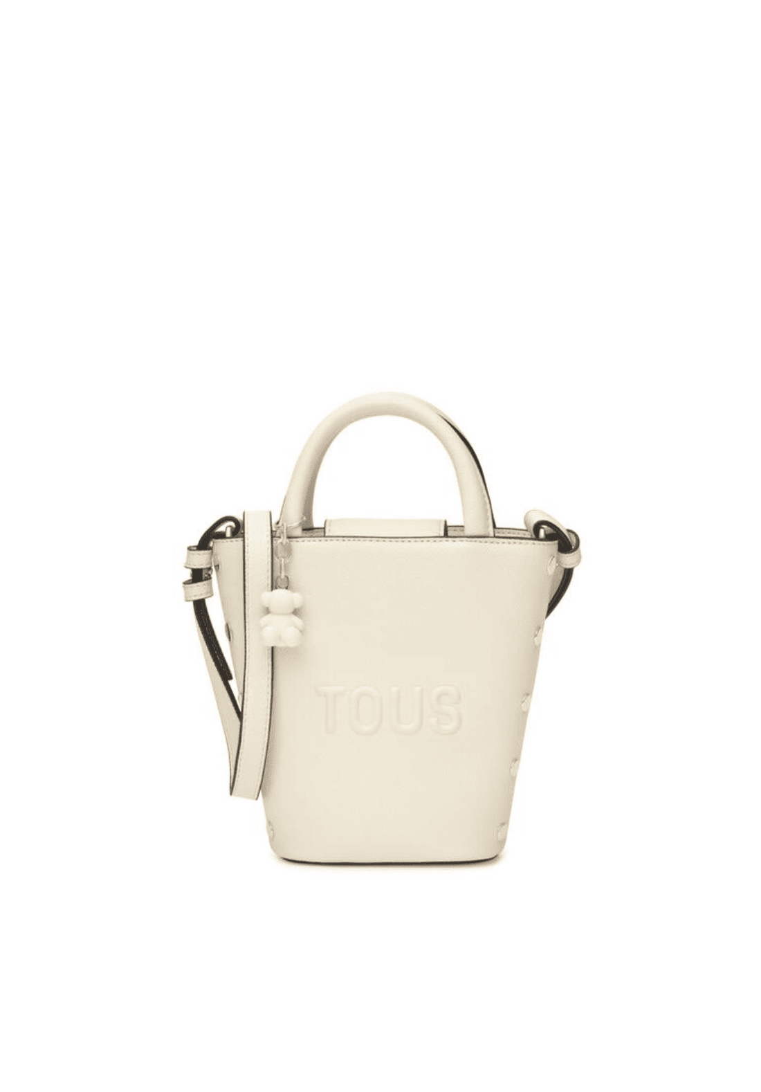 Mini bolso TOUS Back to basics de poliuretano con cierre con botón magnético. Asas fijas de mano y asa bandolera ajustable y desmontable. Incorpora un bonito detalle de oso colgante.