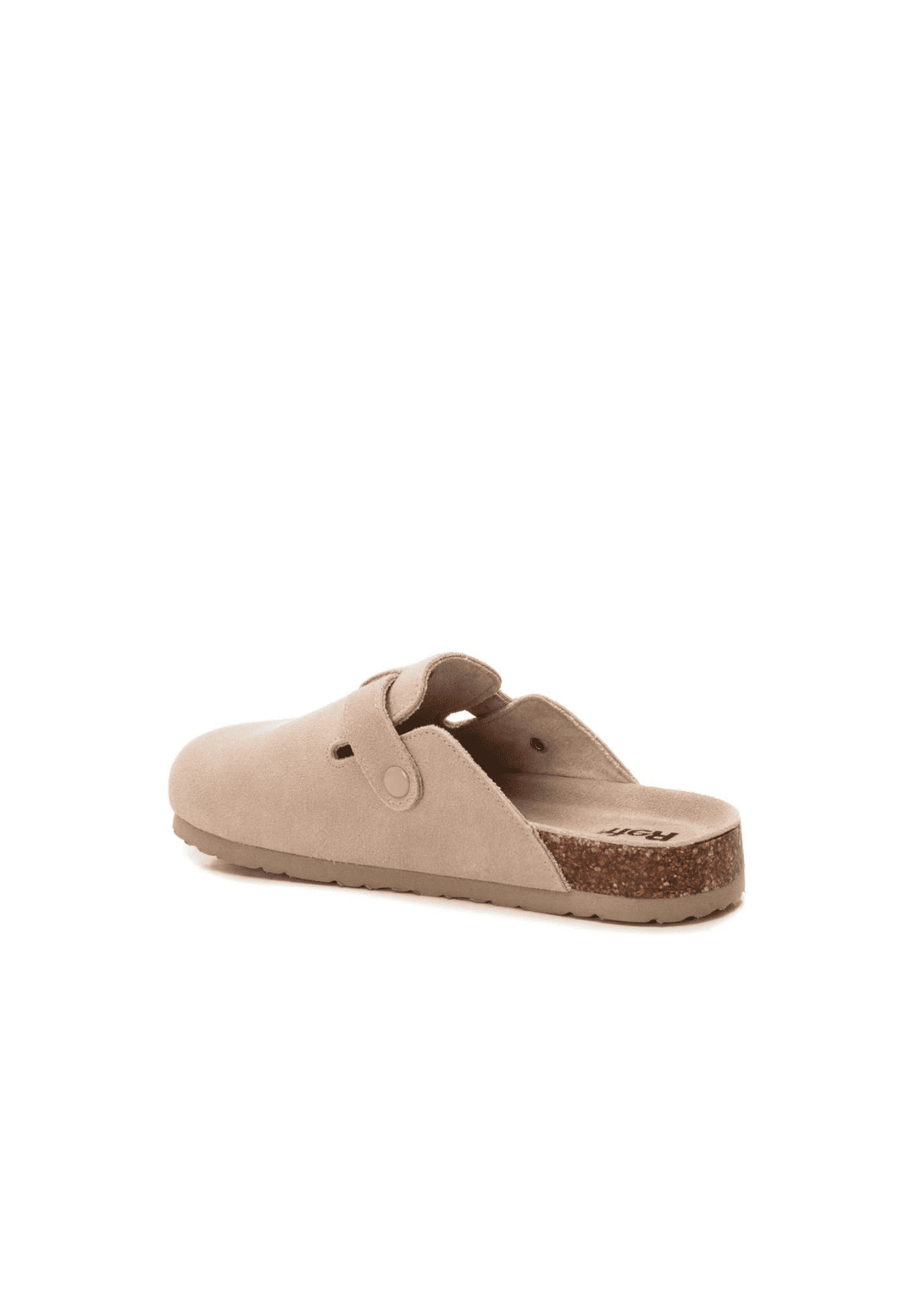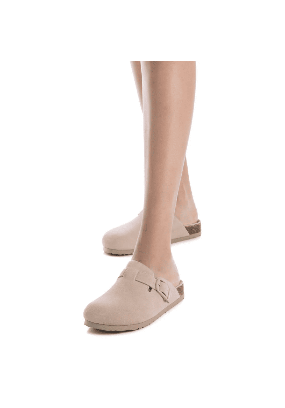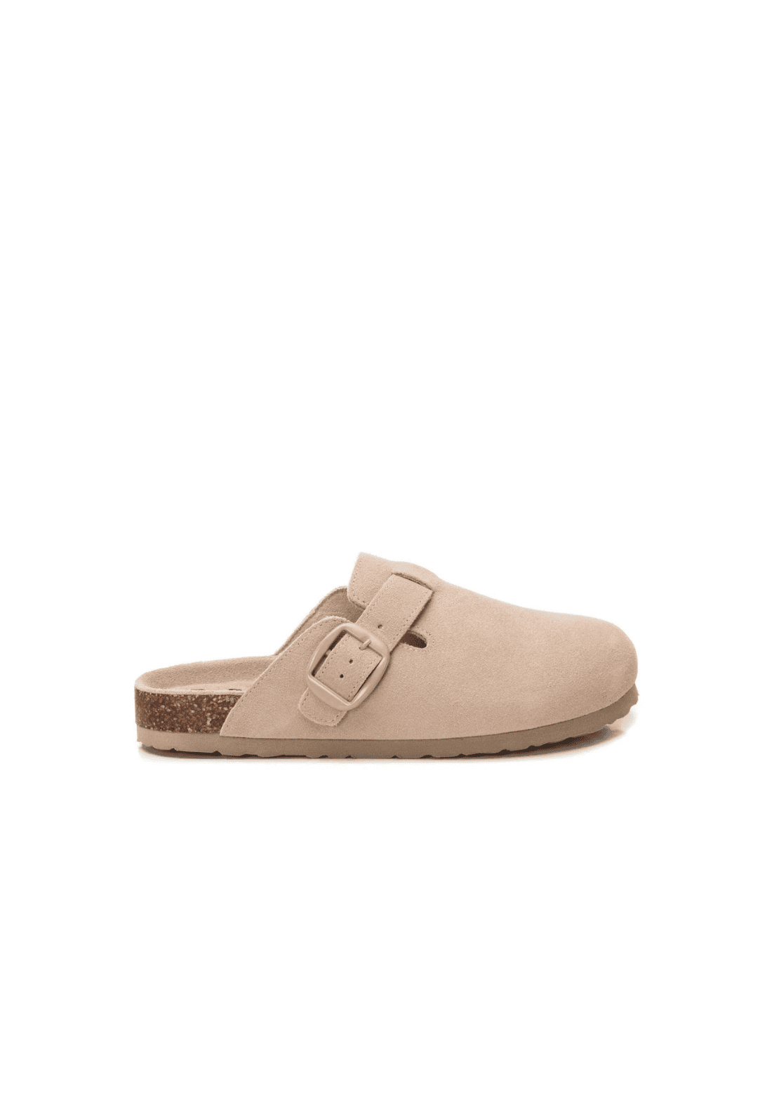 Zueco de mujer, de la marca Refresh. Fabricado en piel serraje. Correa con hebilla. Cómoda planta tipo bio con suela de goma antideslizante.