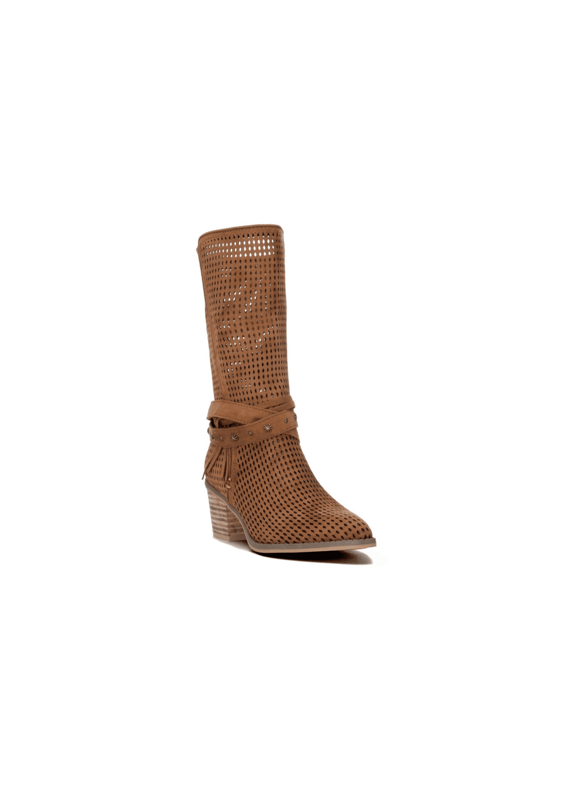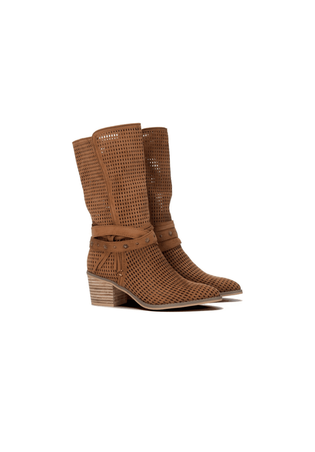 Bota de mujer, de la marca Refresh. Fabricada en antelina troquelada con varias tiras decorativas atadas al tobillo. Altura de la caña de 25 cm.