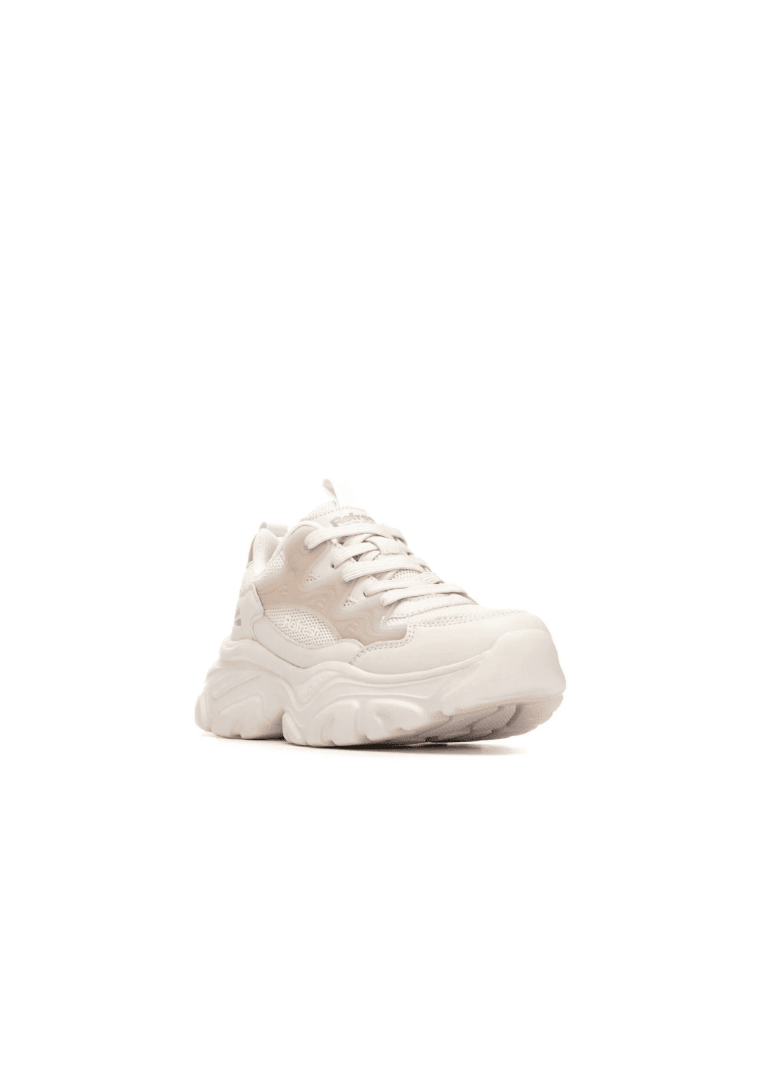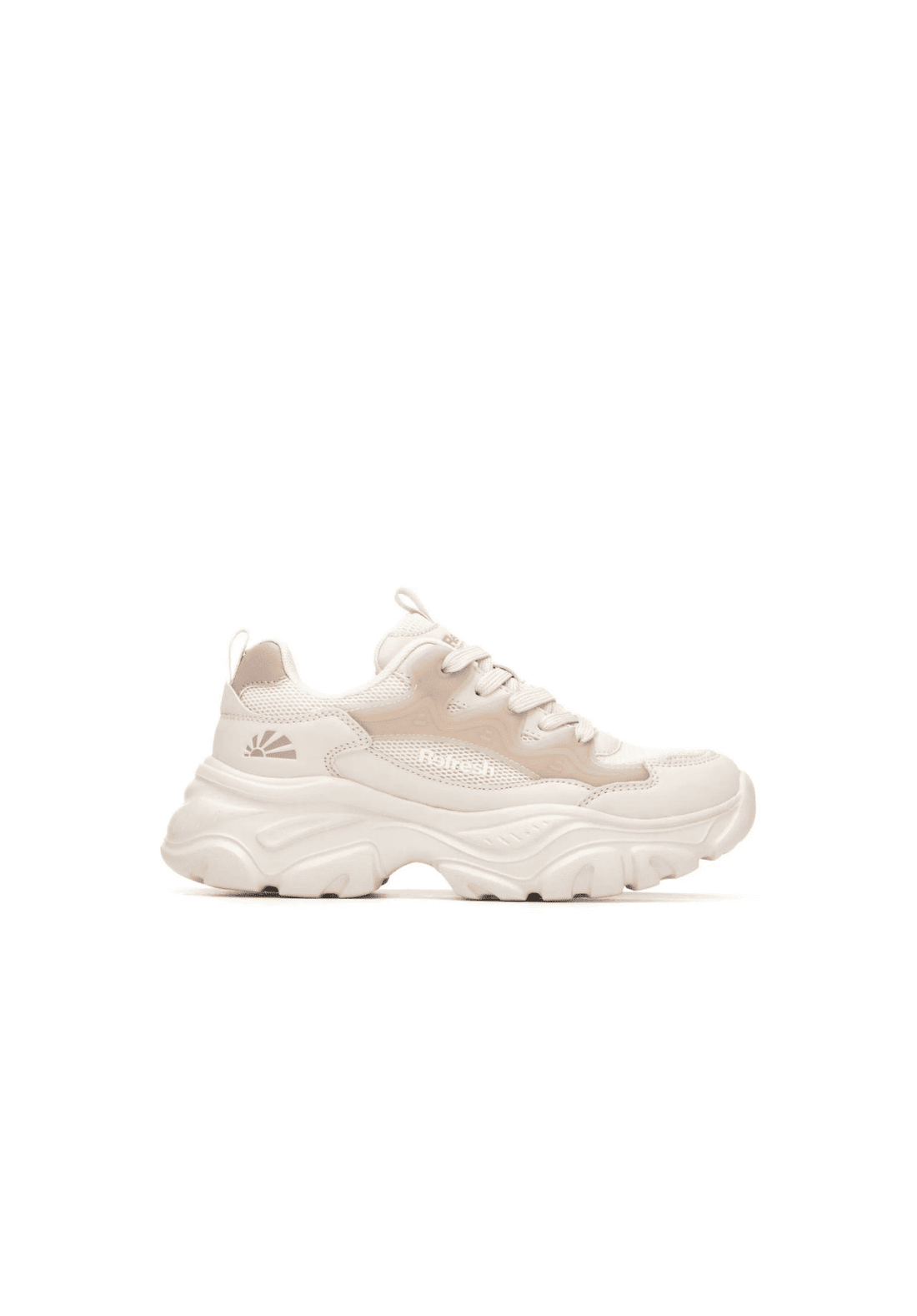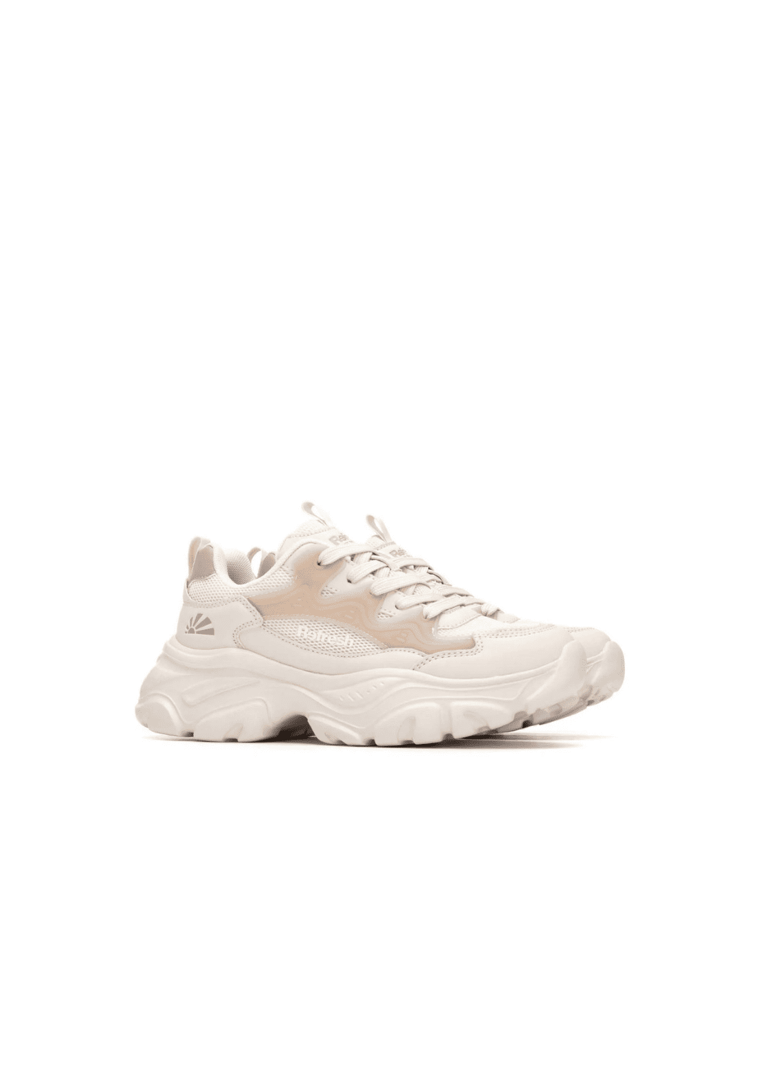 Zapatilla de mujer. Fabricada en material que imita a la piel combinado con tejido técnico. Cordones regulables. Tirador trasero y delantero para facilitar la puesta. Suela chunky de goma. Este modelo ha obtenido el certificado vegano por la organización mundial PETA (Organización de los derechos de los animales).