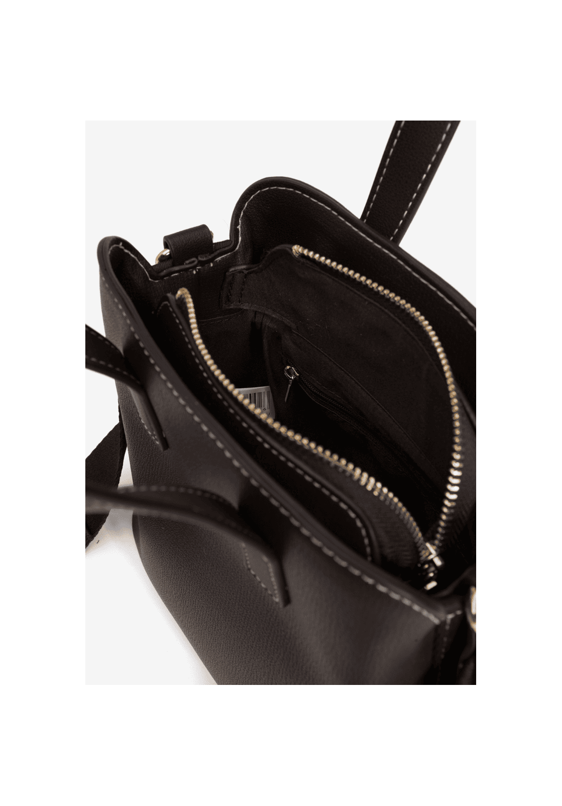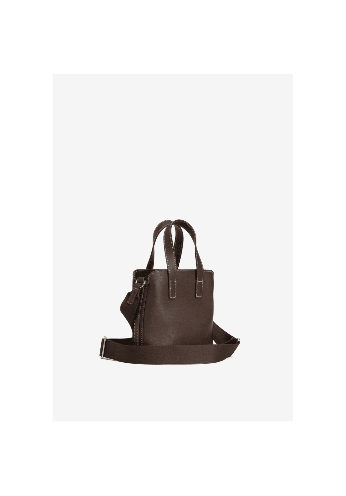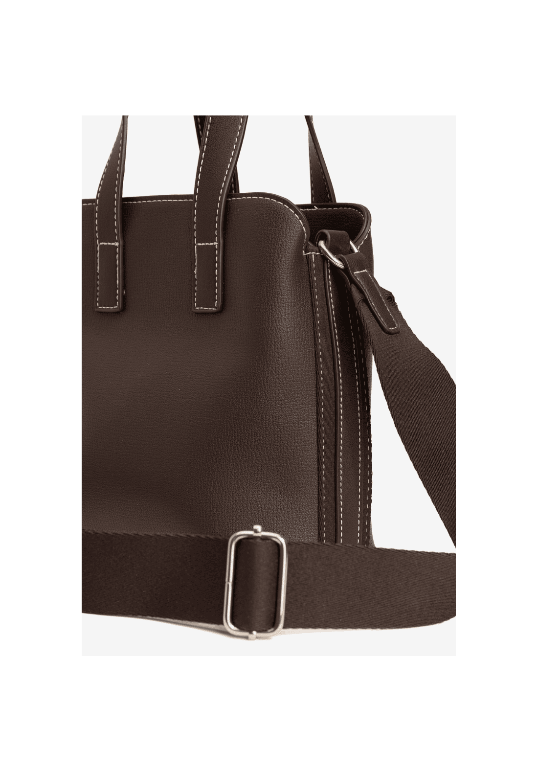 Bolso marrón, con costuras claras, cremallera dorada y asa ancha ajustable.