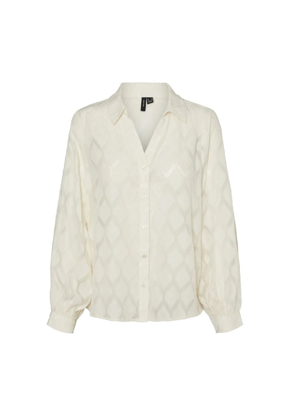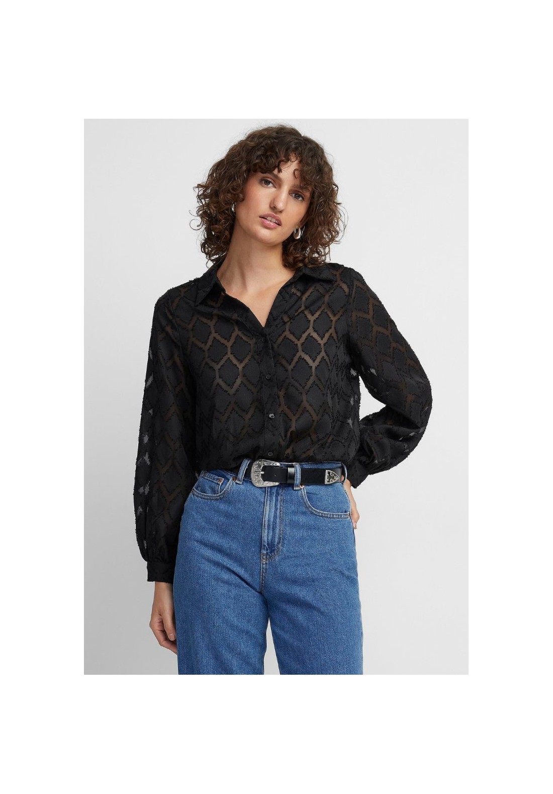 Blusa de manga larga corte camisero con estampado de rombos semi transparente.