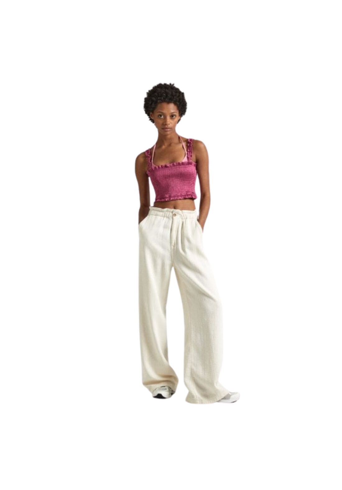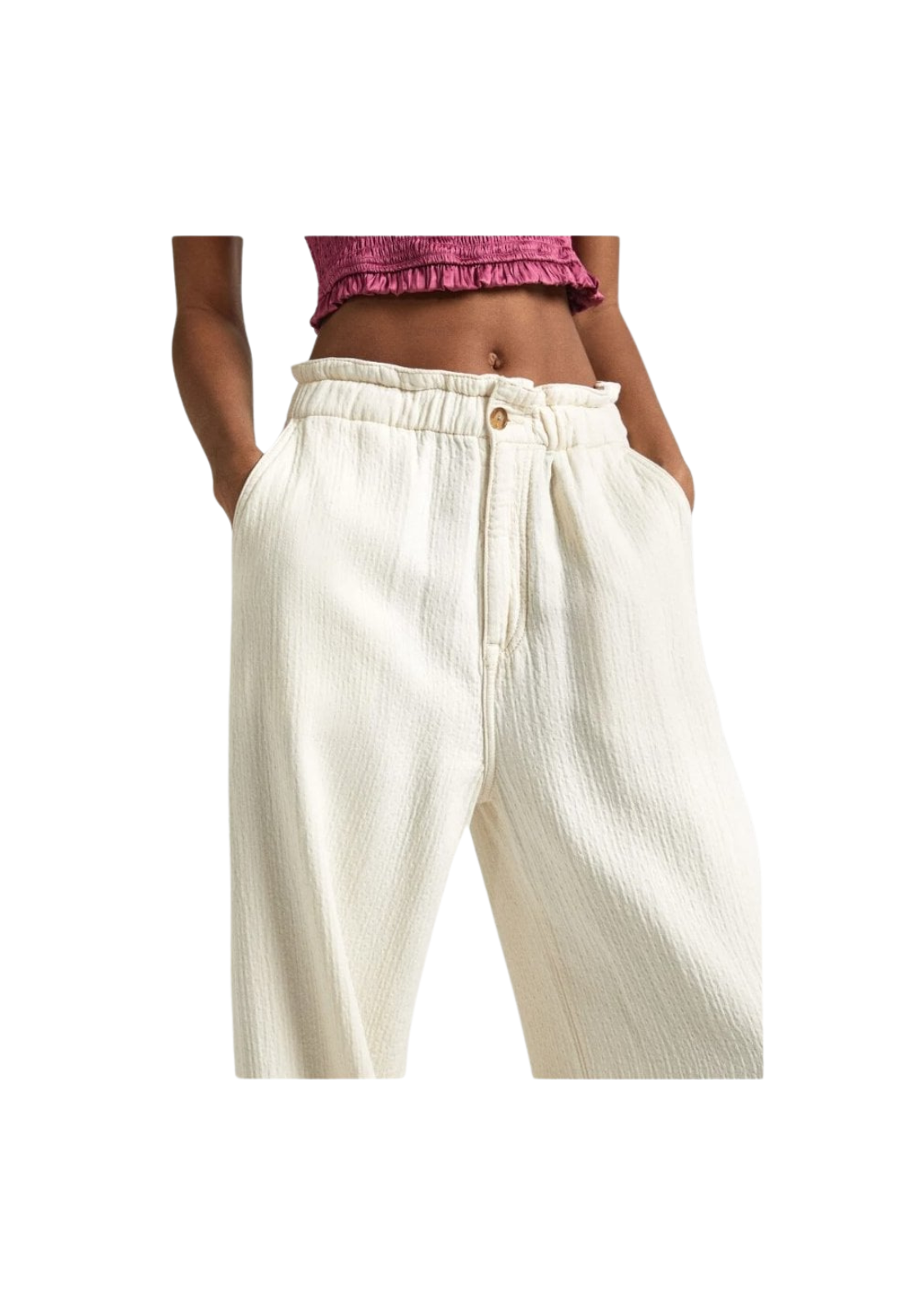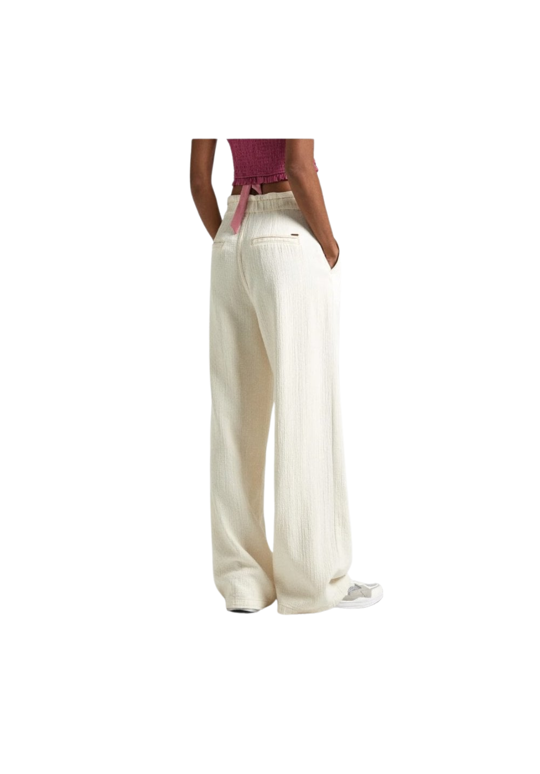 Pantalones de cintura alta y ajustable. La pernera es recta. Tiene bolsillos italianos delanteros y traseros de ribete. El cierre es de cremallera y botón.