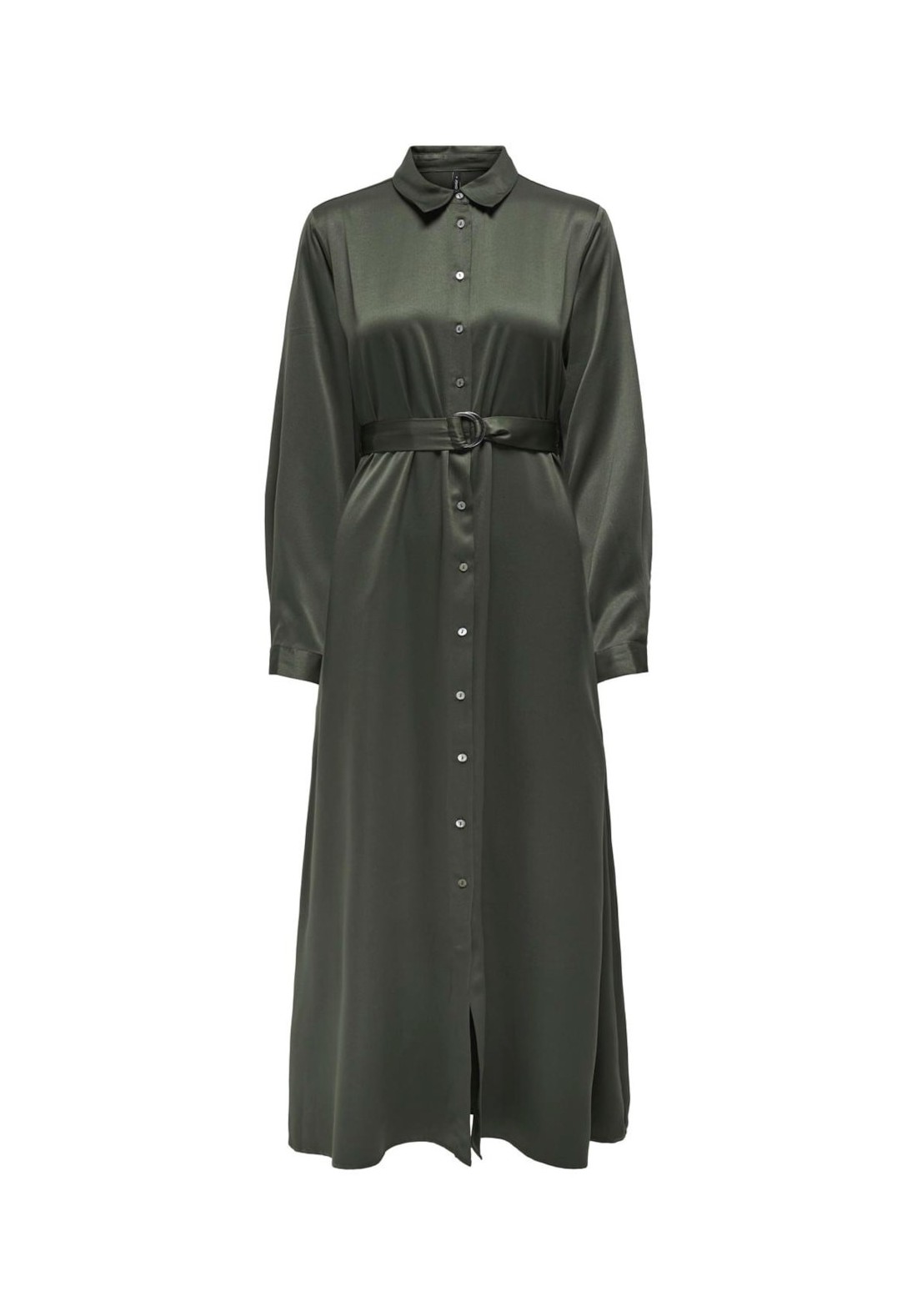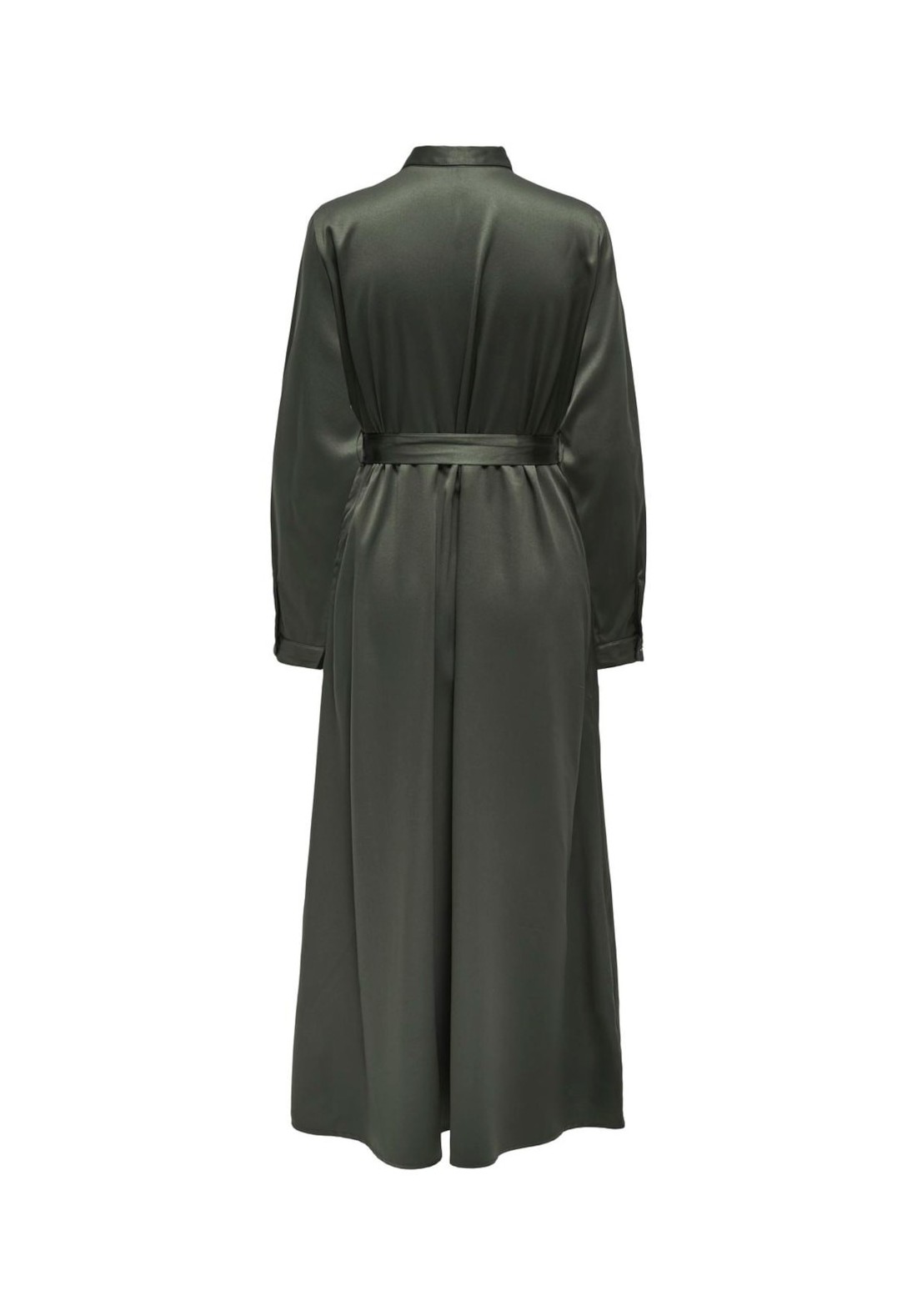 Vestido camillero con cinturón en largo midi y tejido brillante y suave.