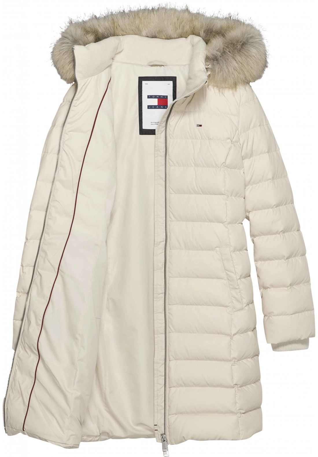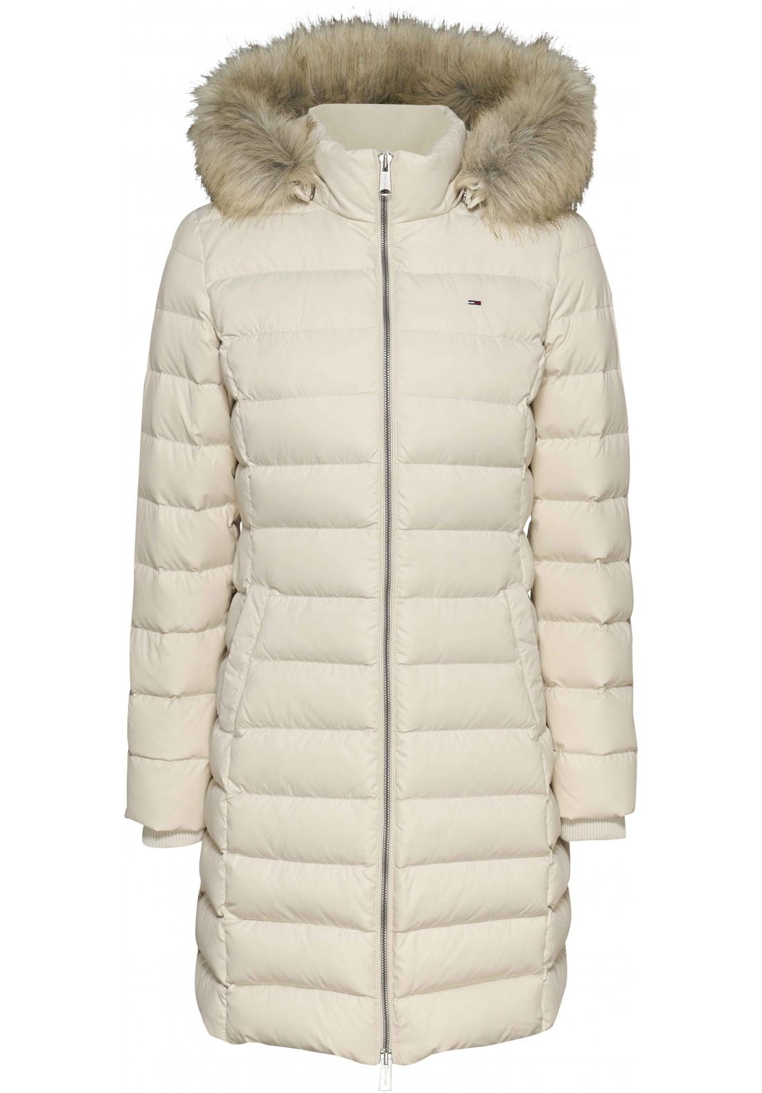 Abrigo largo acolchado con capucha de pelito desmontable. Tiene bolsillos laterales.