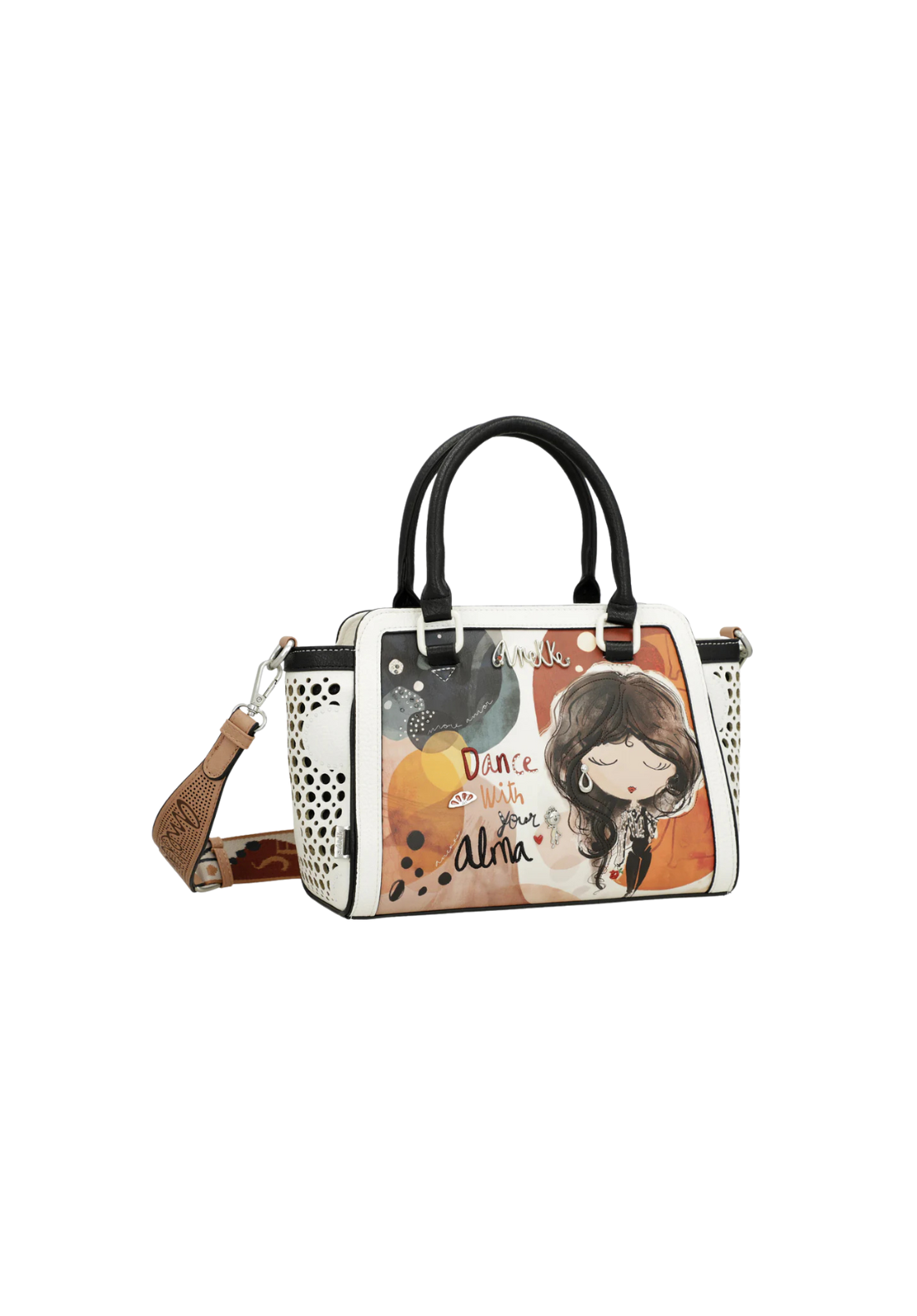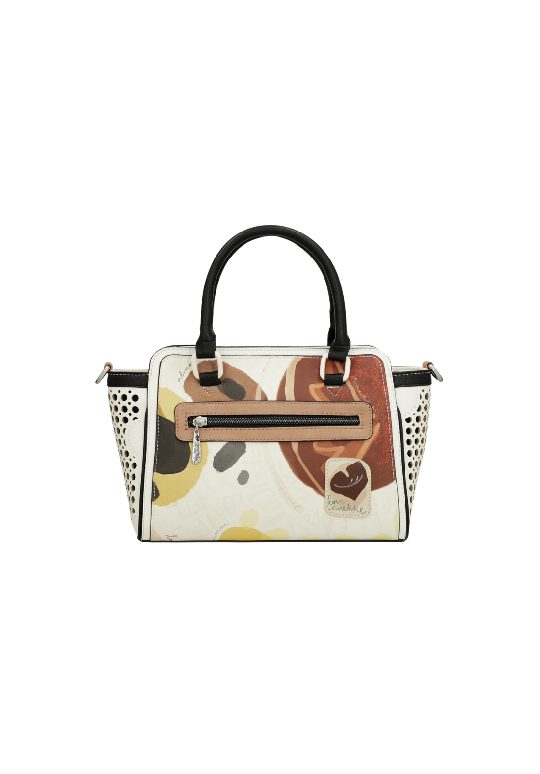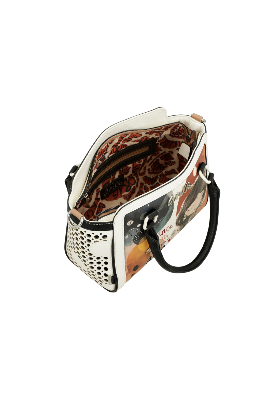 Este bolso bowling es de tamaño medio-grande y tiene un bolsillo trasero. Lleva dos asas de mano y una bandolera regulable extraíble. El interior está forrado y lleva bolsillos.