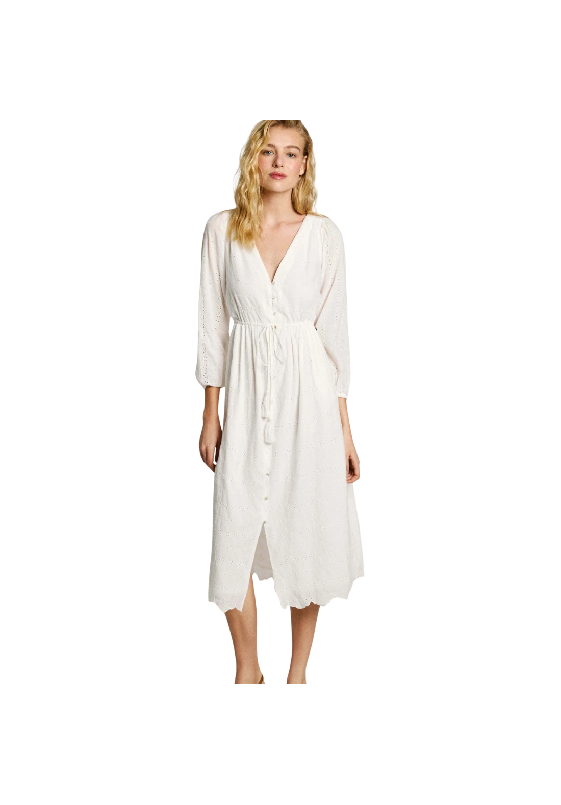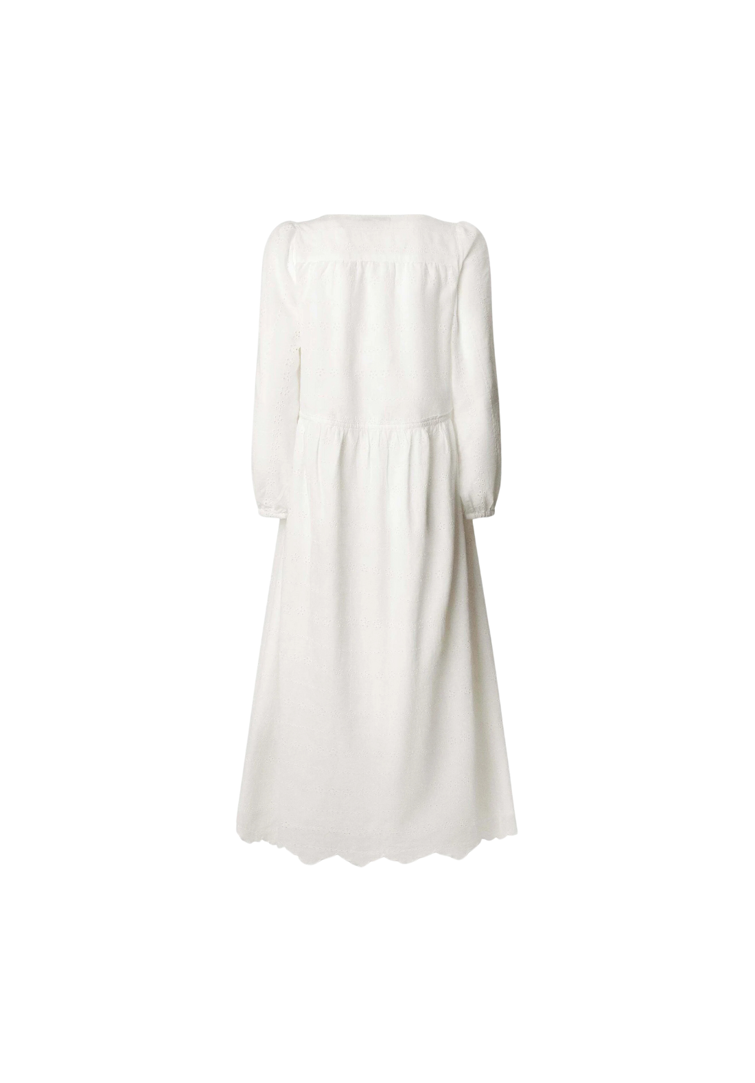 Vestido de manga larga, con cuello en V y cierre de botones. Tiene detalle de combinación.