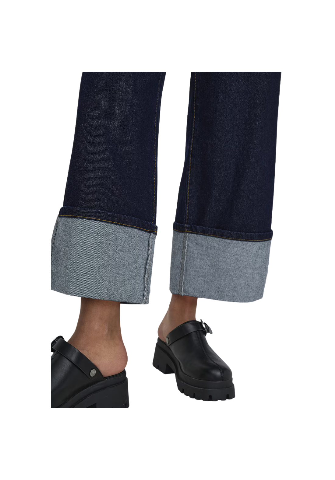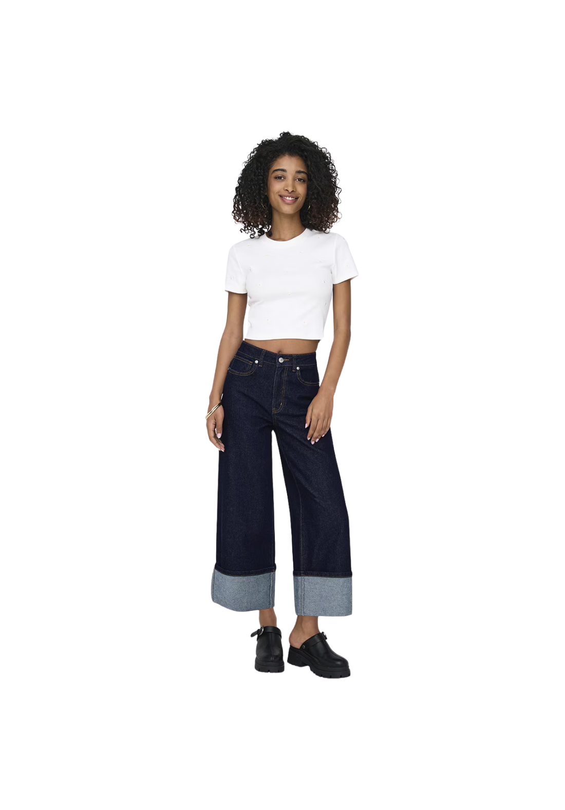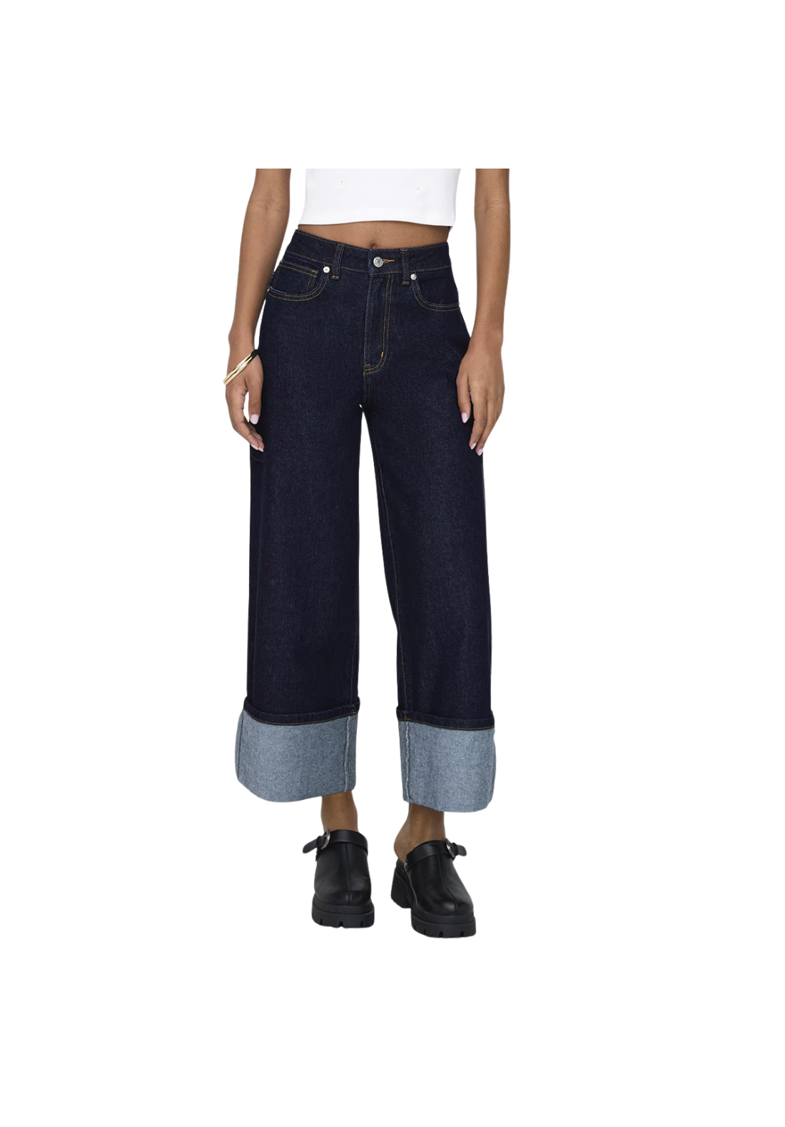 Vaquero largo ancho con cremallera y botón. Cintura alta.