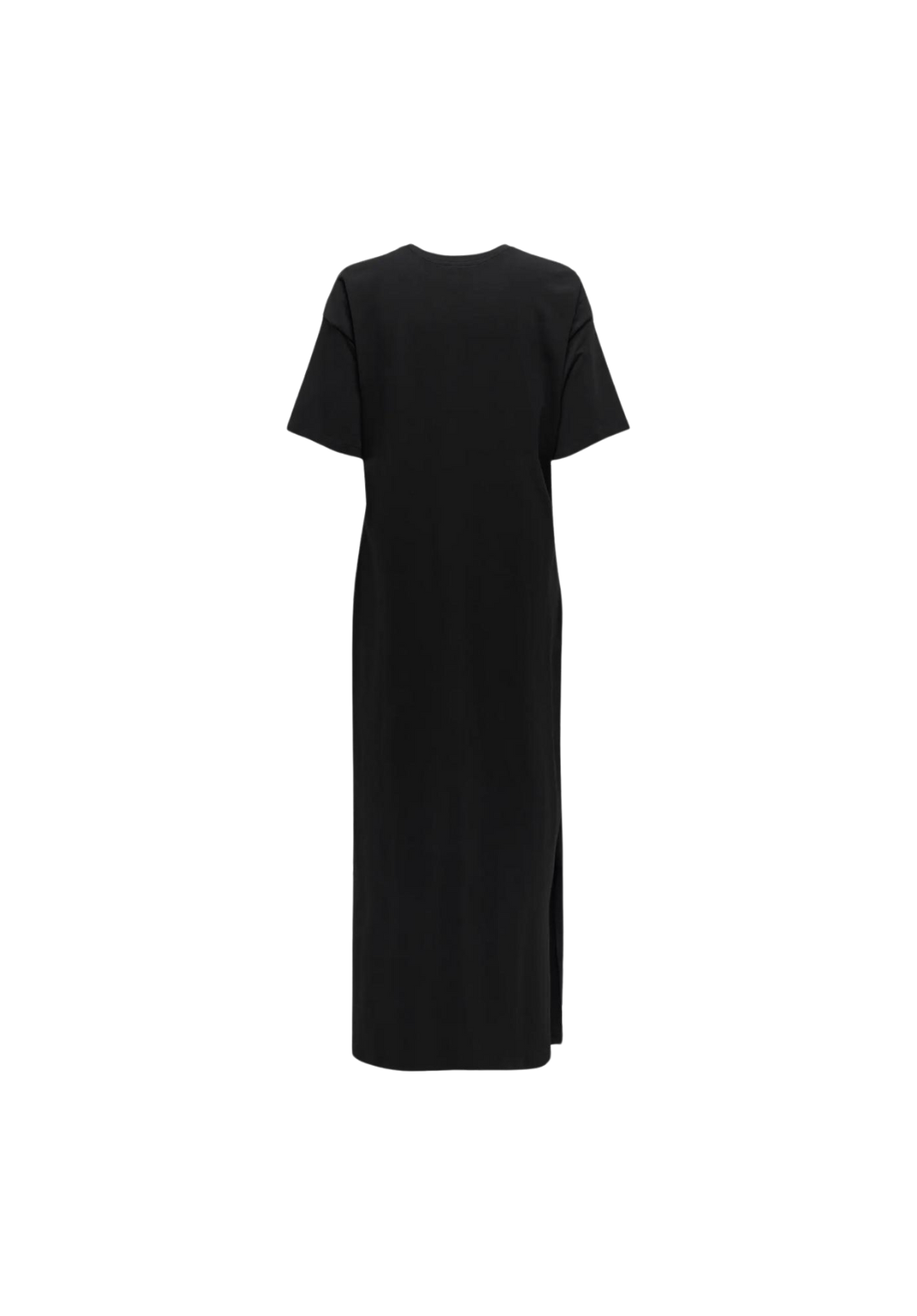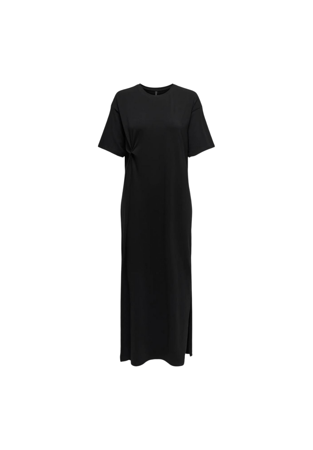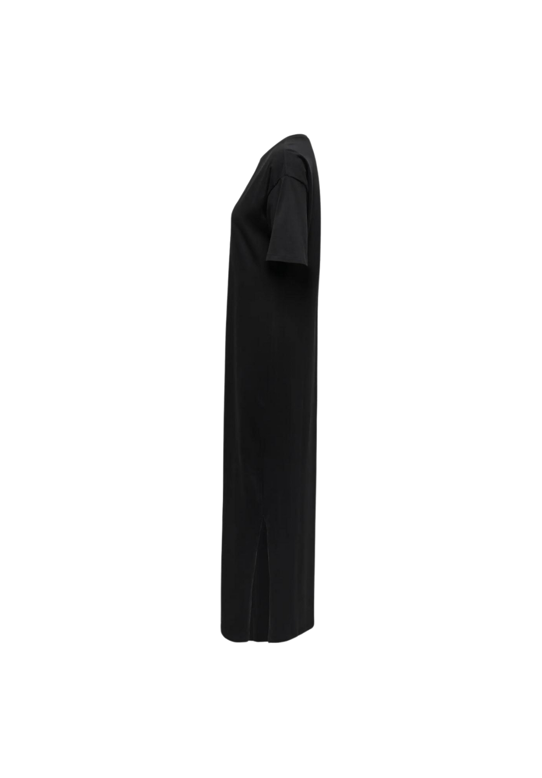 Vestido de cuello redondo, manga corta con un fruncido en el lateral. Corte midi y abertura lateral.
