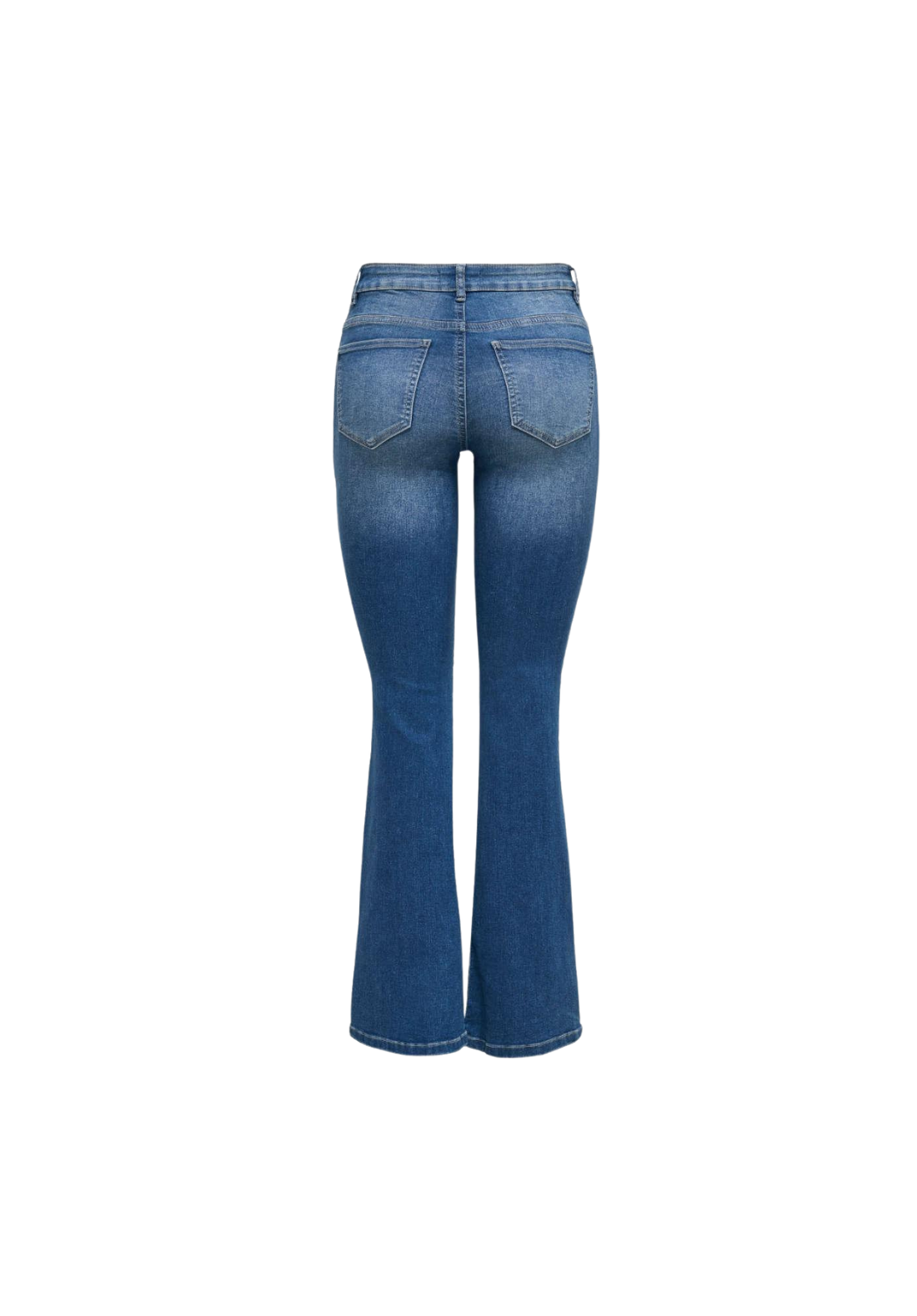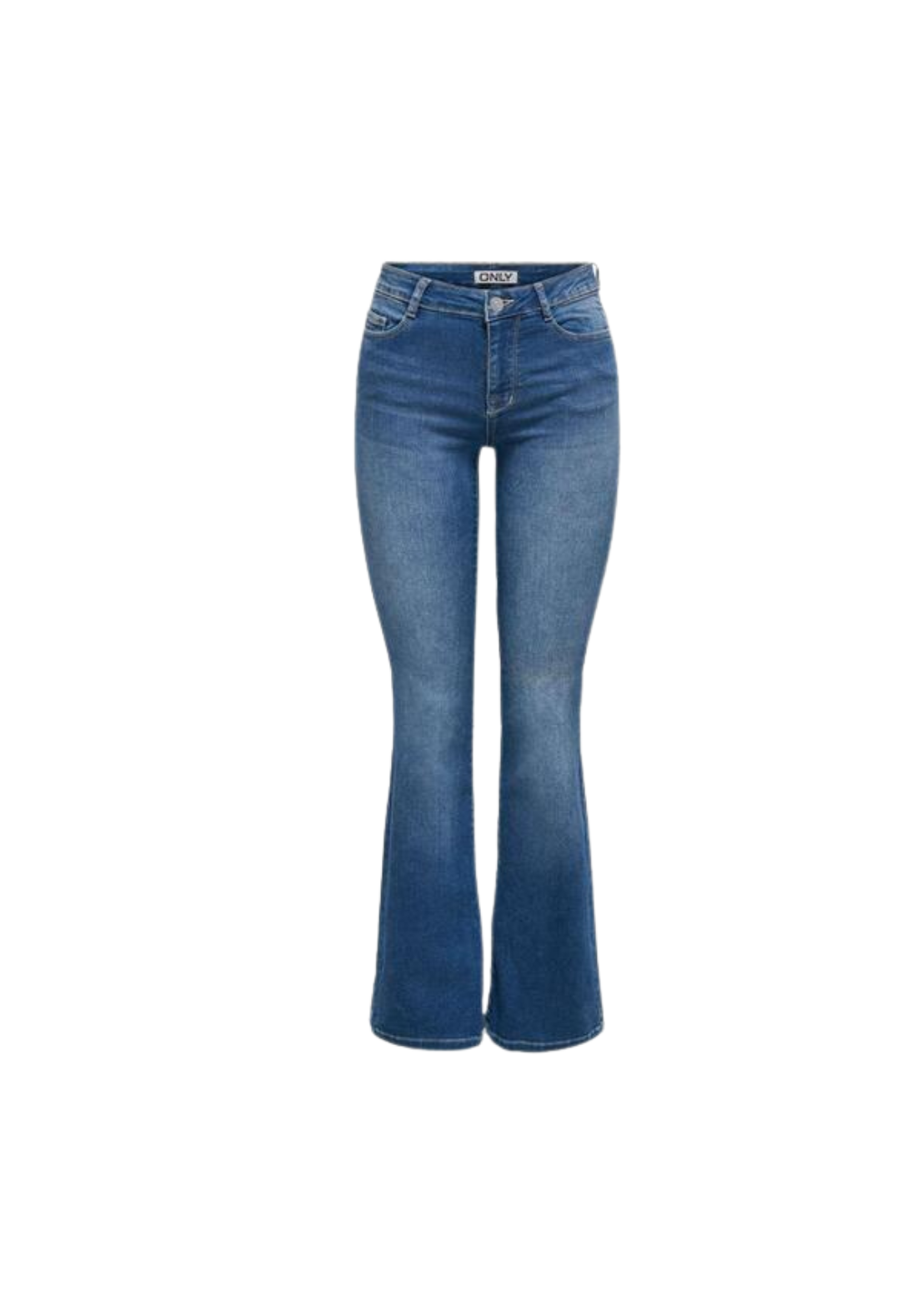 Pantalón vaquero azul medio, desgastado. Tiro alto, cierre de botón y cremallera, cinco bolsillos y trabilla para el cinturón. Corte de la pernera acampanada.