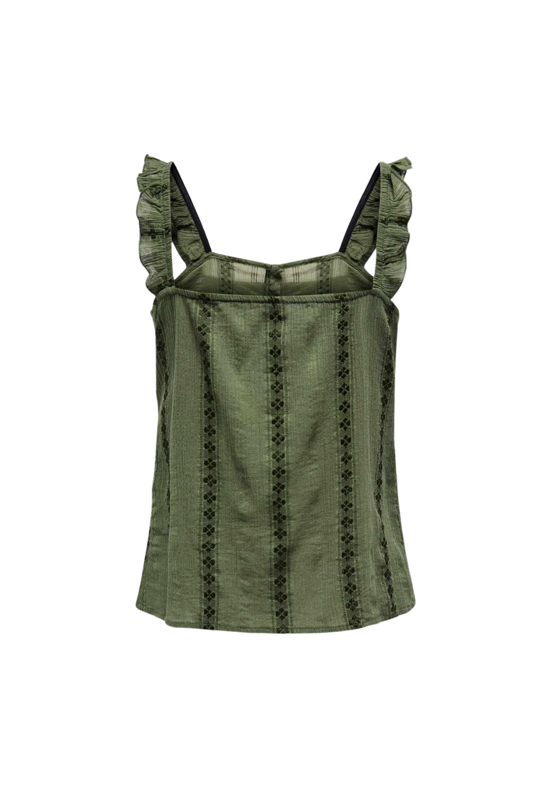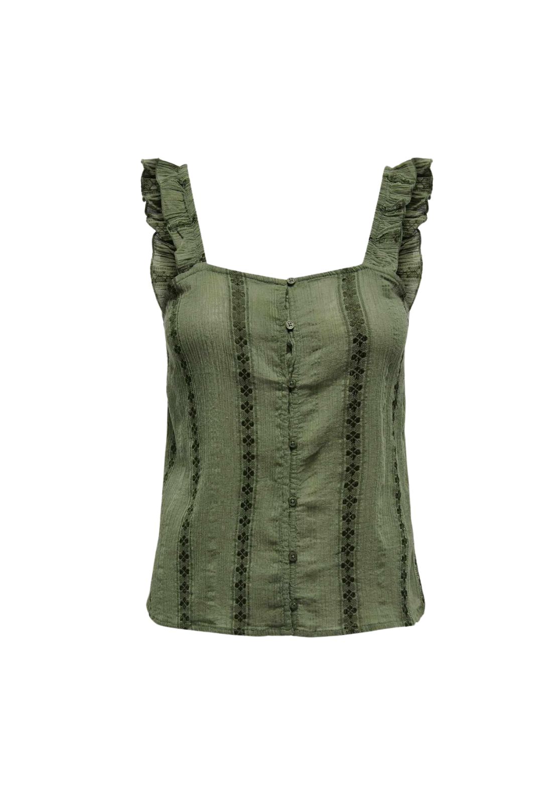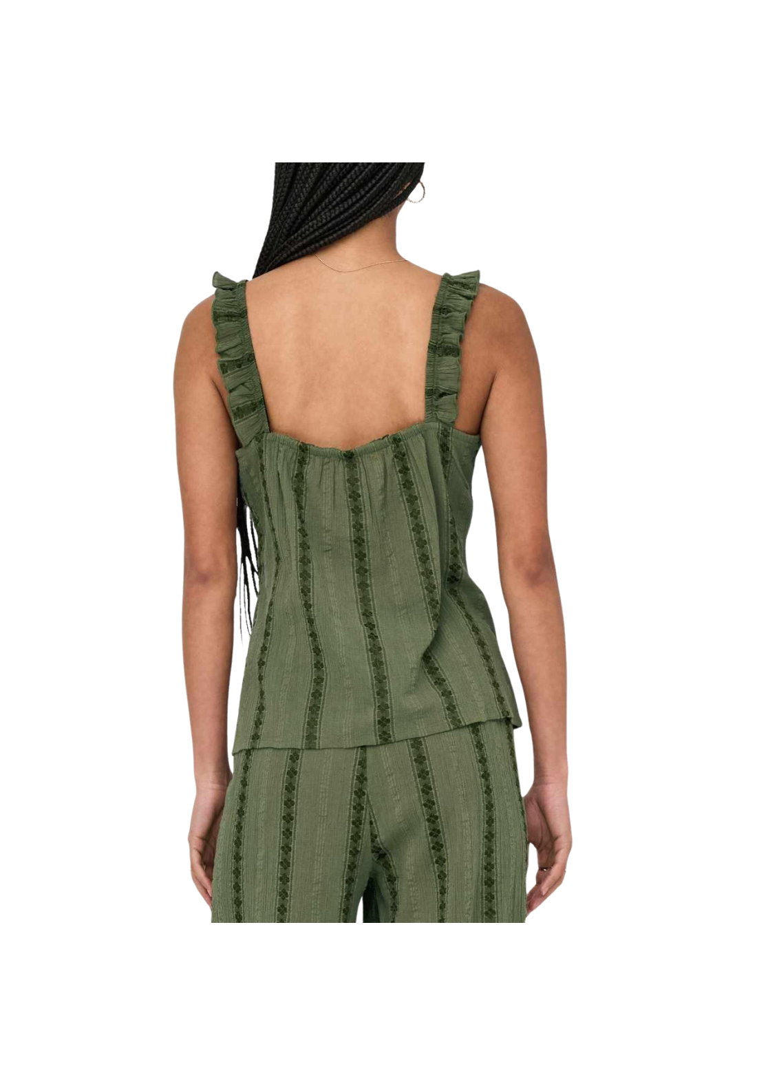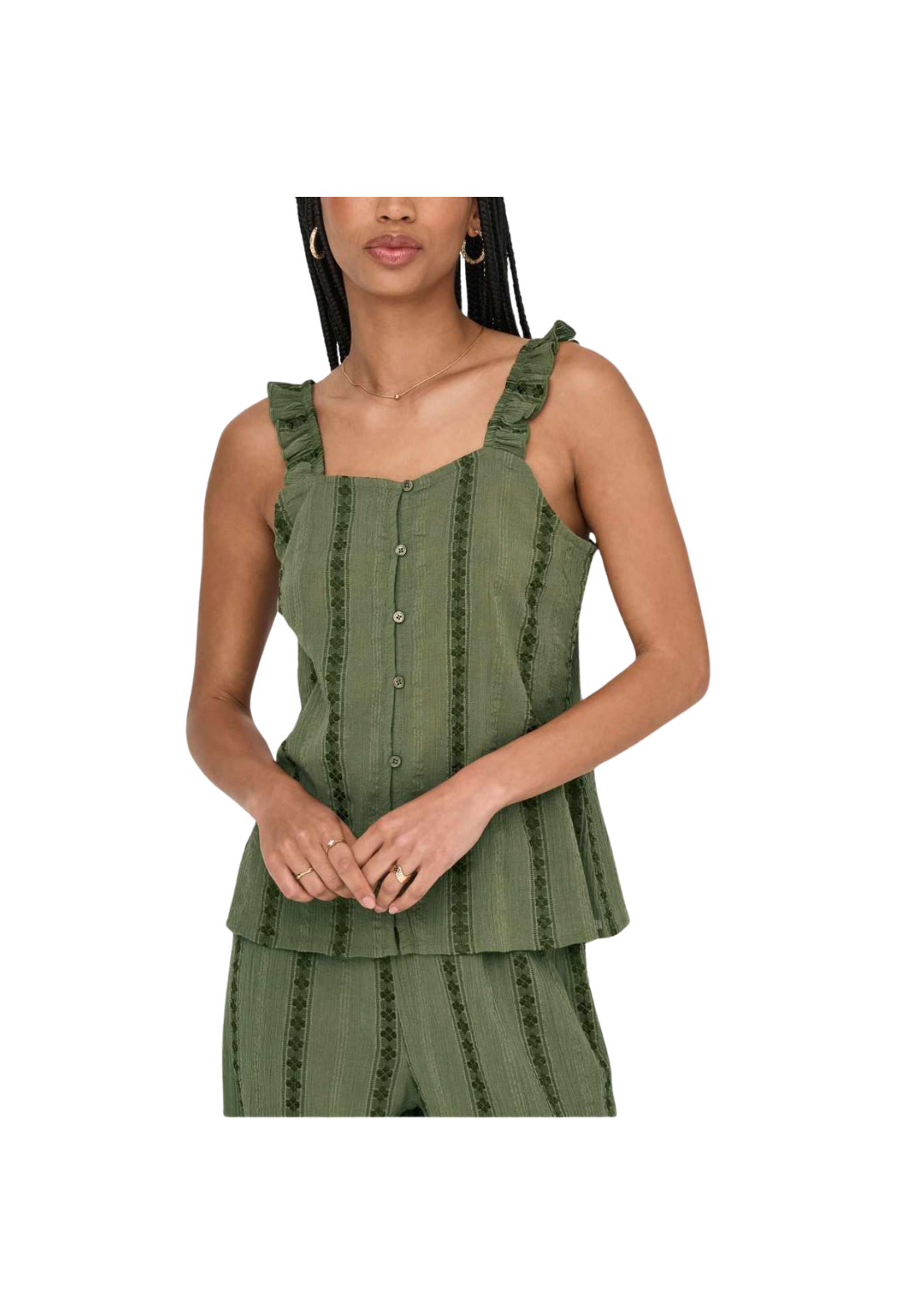 Camiseta de tirante ancho en color verde oscuro con bordados a tono. Corte relajado y escote amplio delantero y trasero. Viene con un pequeño volante en los tirantes. El cierre es frontal y tiene botones.
