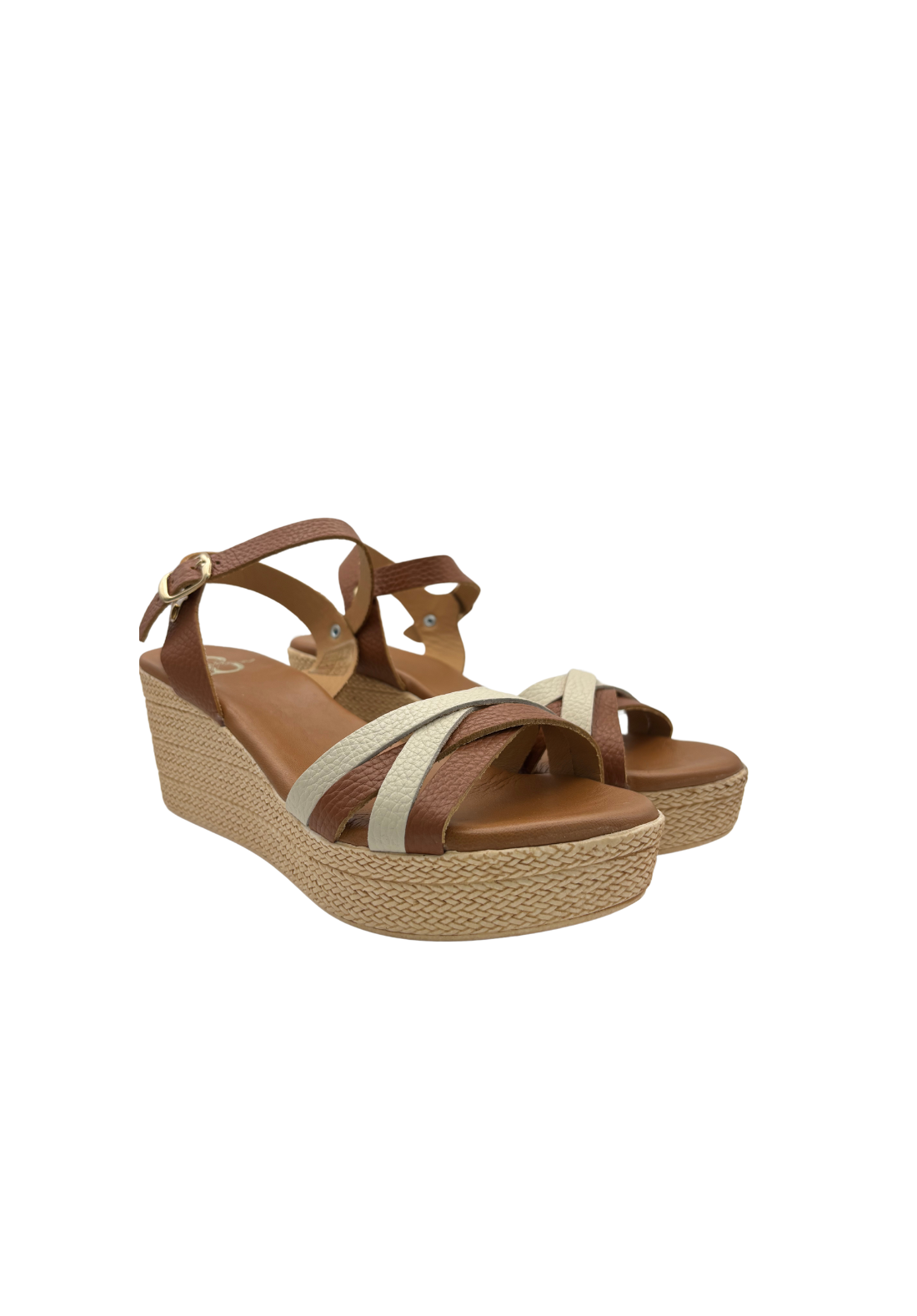 Sandalia de cuña con tiras bicolores y cierre con hebilla alrededor del tobillo.