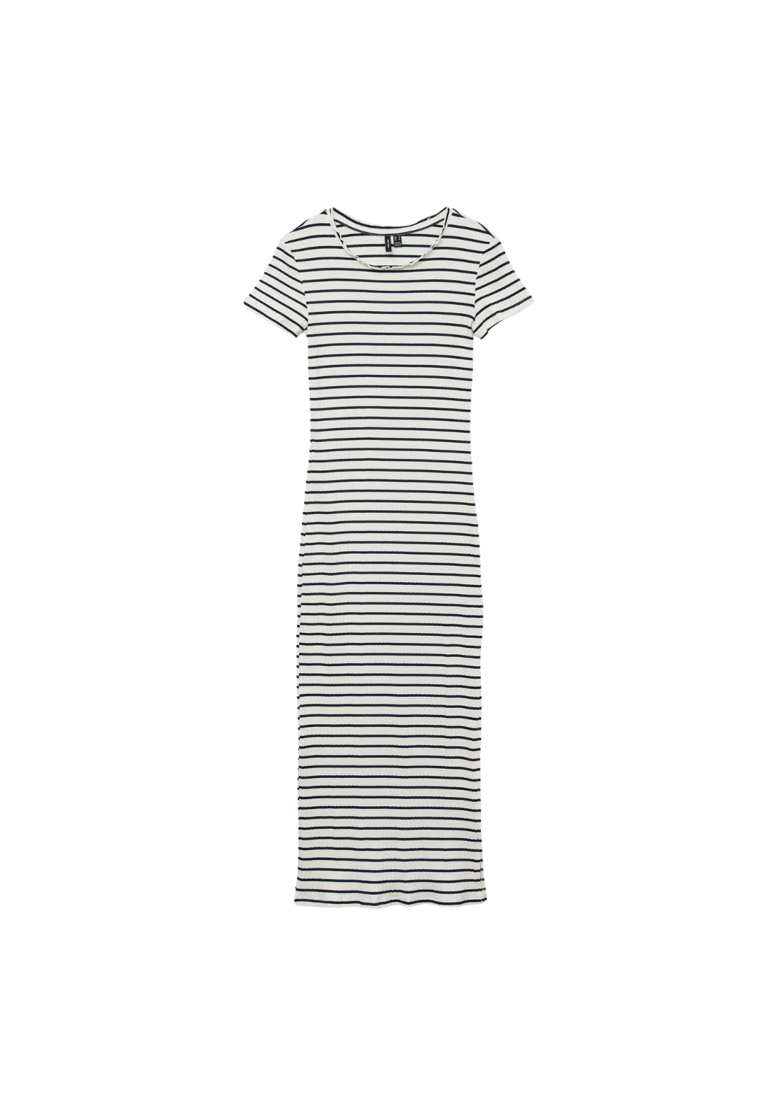 Vestido maxi de cuello redondo y manga corta. Tiene una abertura en la pierna.