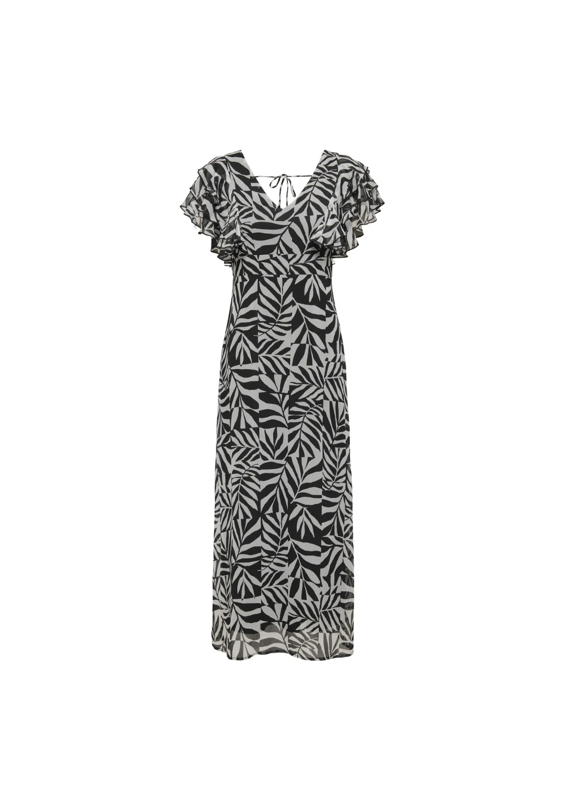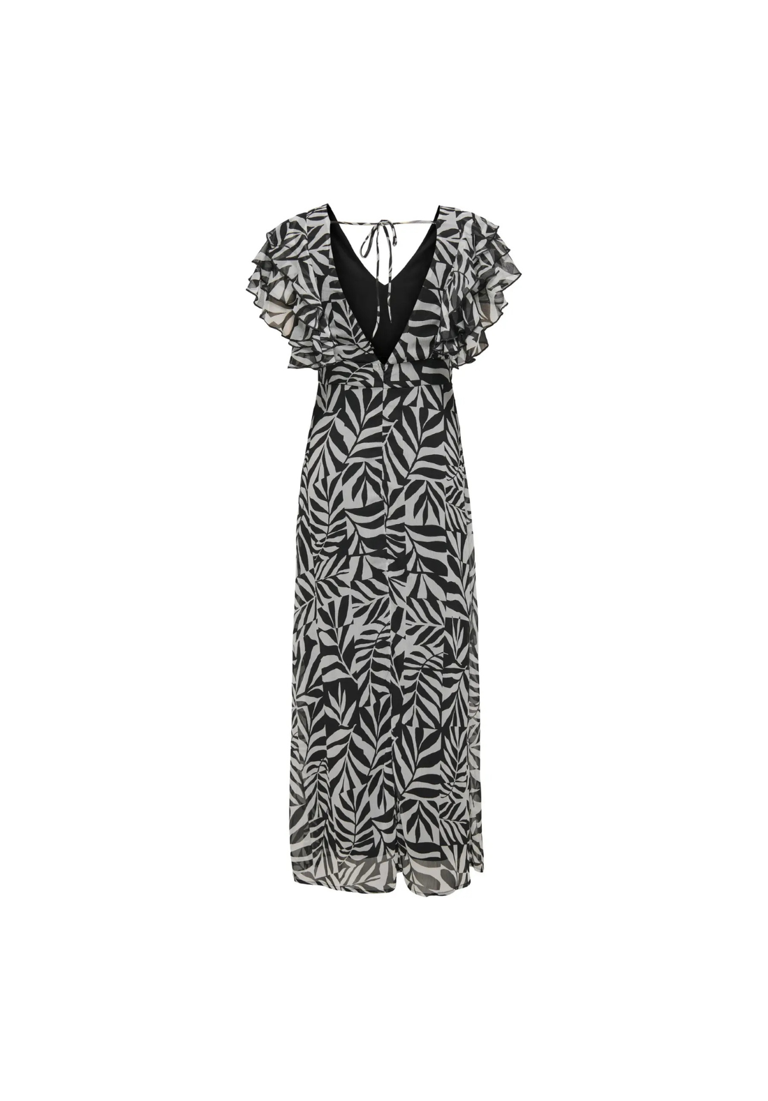 Vestido sin mangas y cuello en V. Cierre con cremallera y largo hasta los tobillos. tiene detalle de lazo y volantes con volumen.