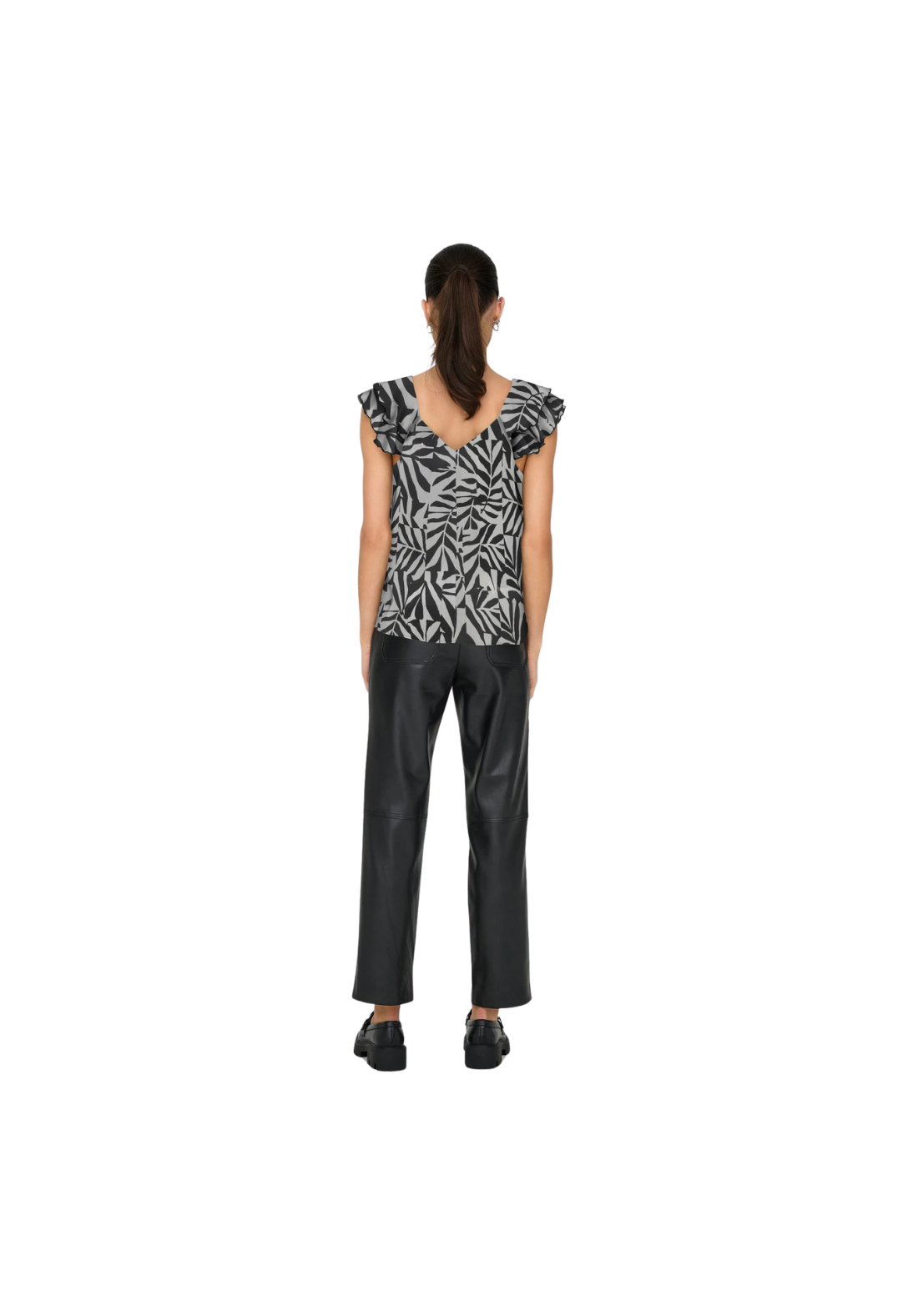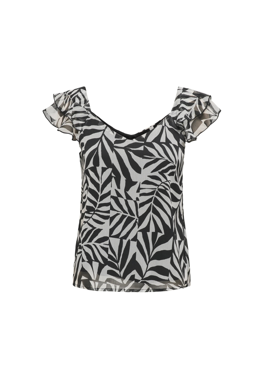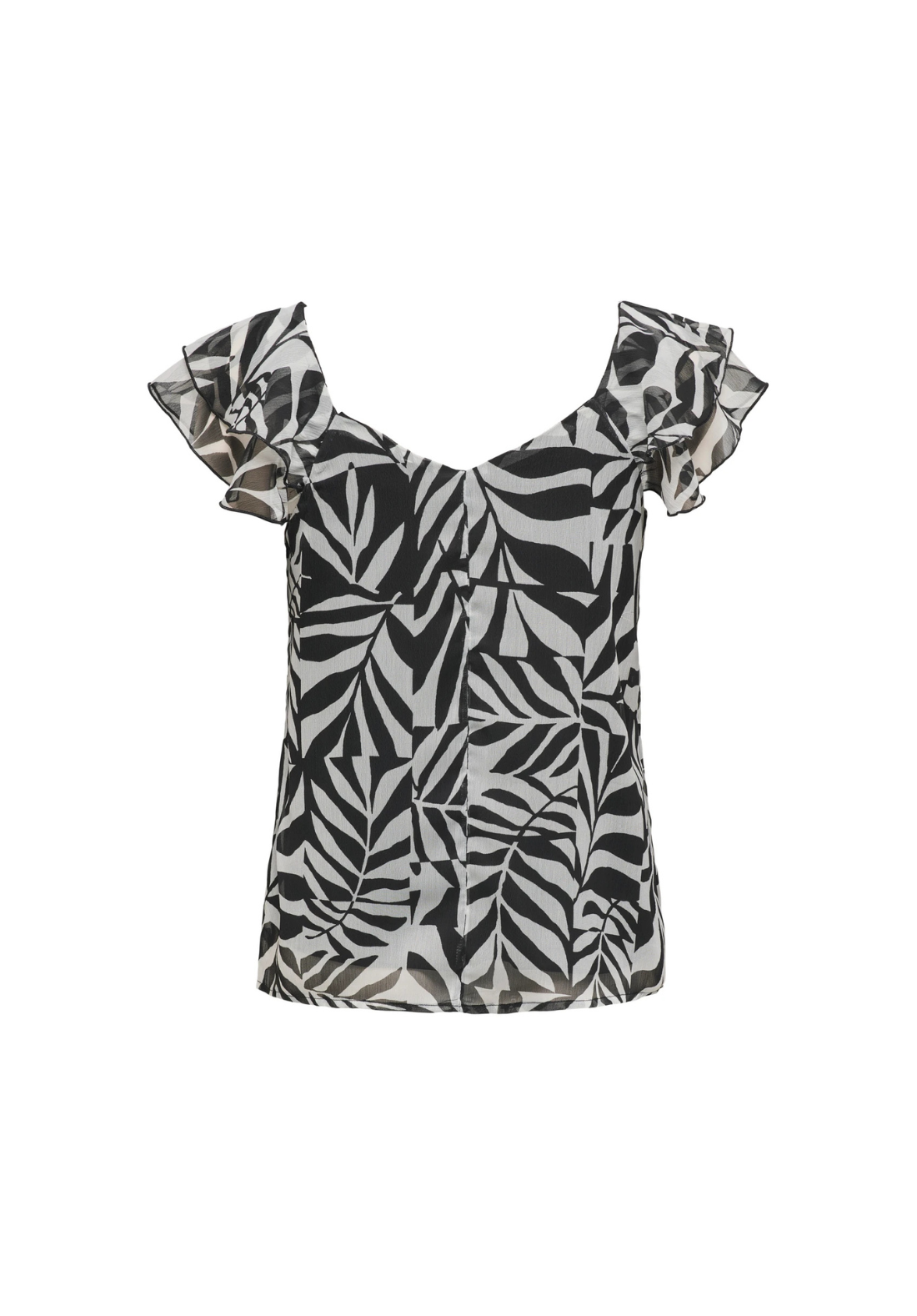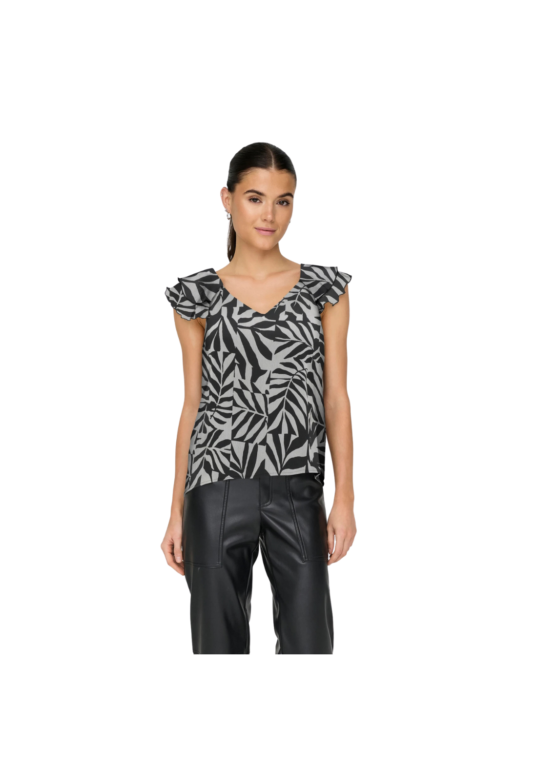 Top con cuello en V y manga japonesa. Tiene volantes con volumen. Corte loose.