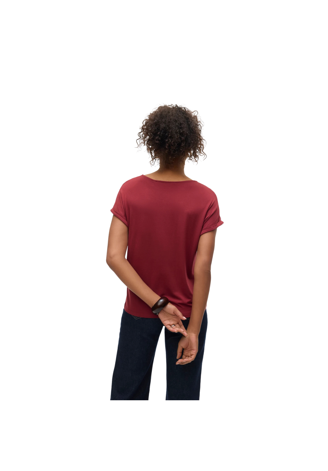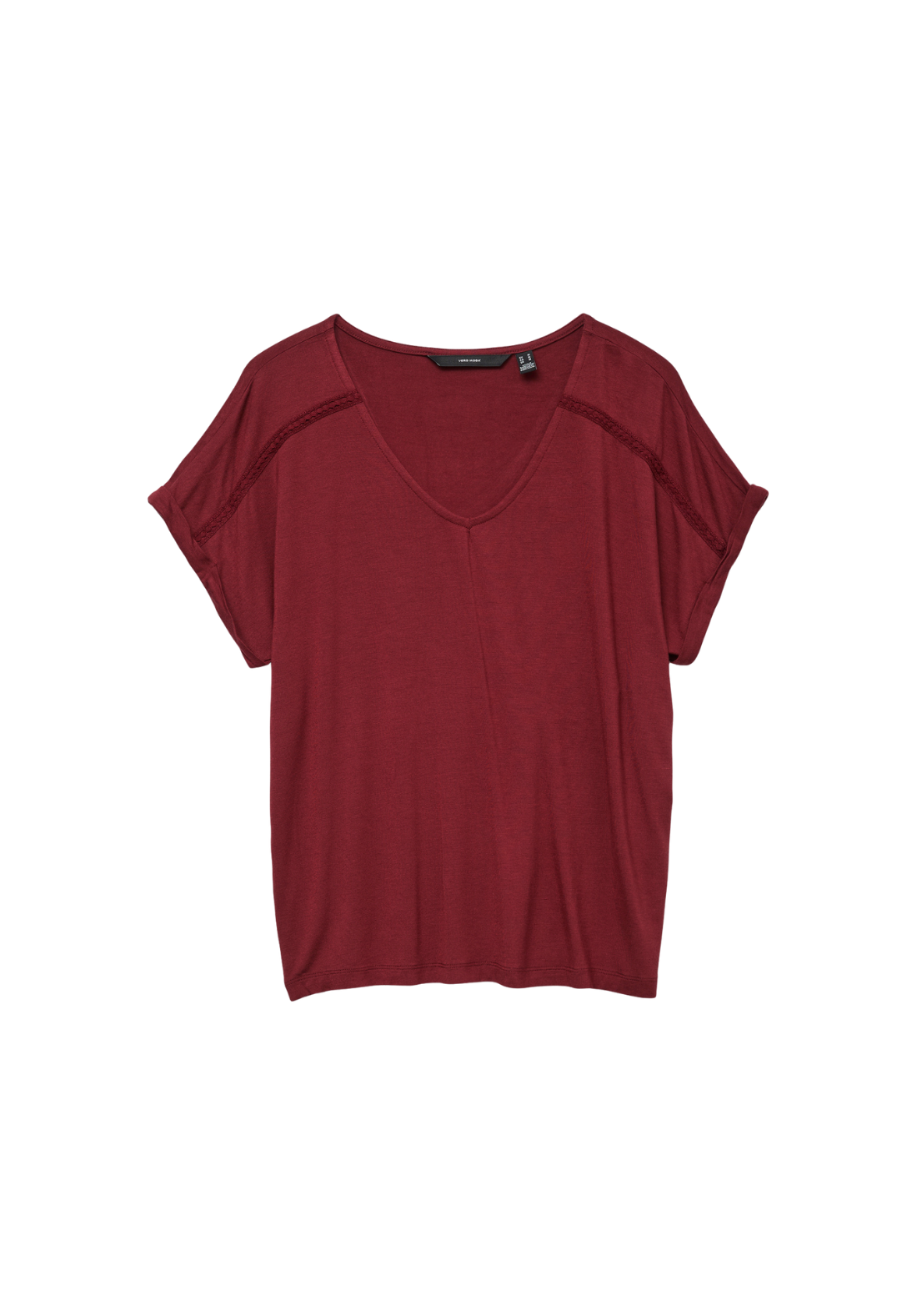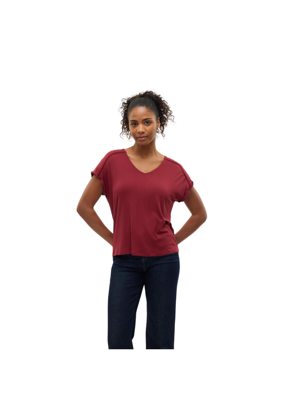 Top de manga corta, con cuello en V. Tiene los puños doblados y detalle de encaje.