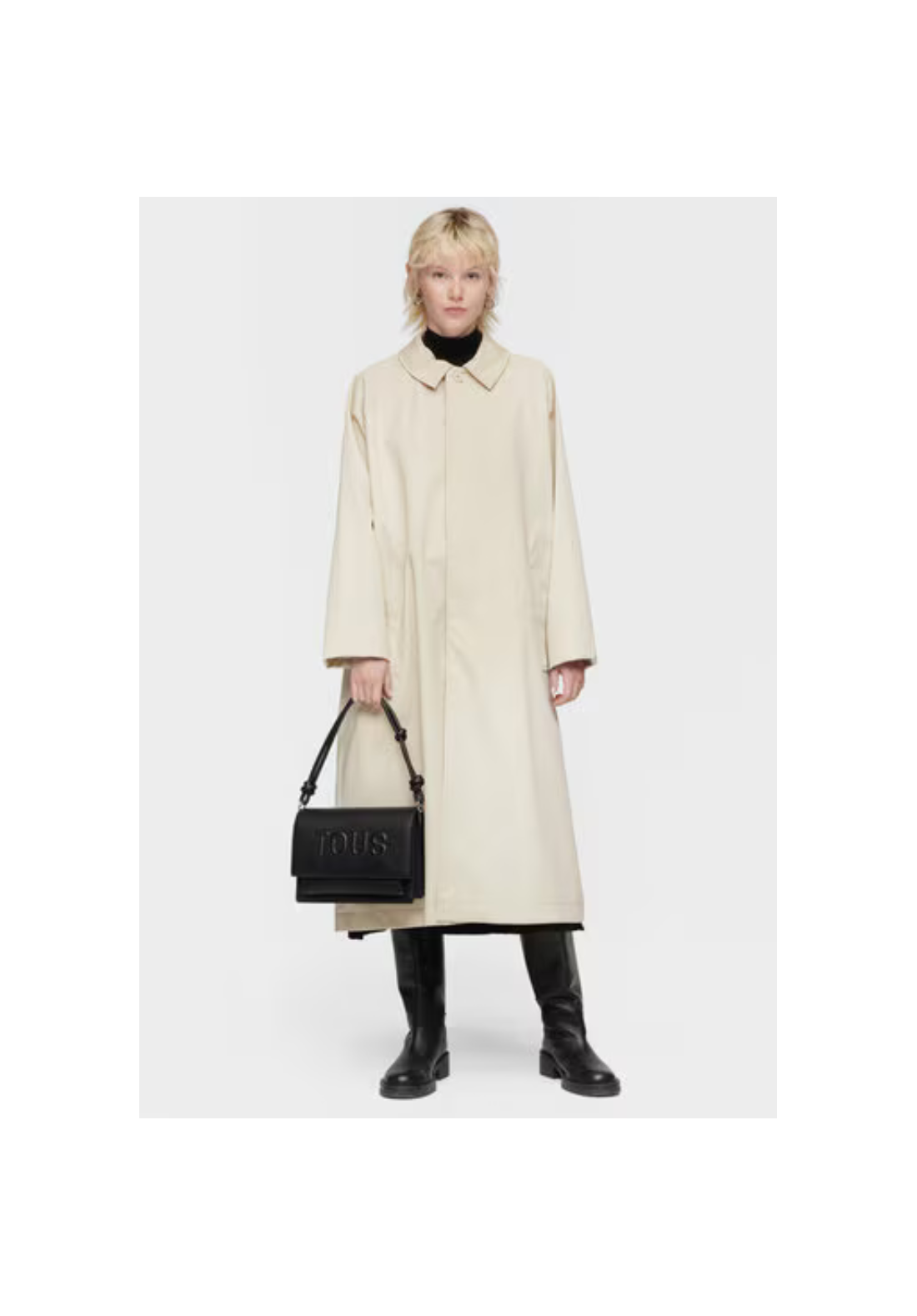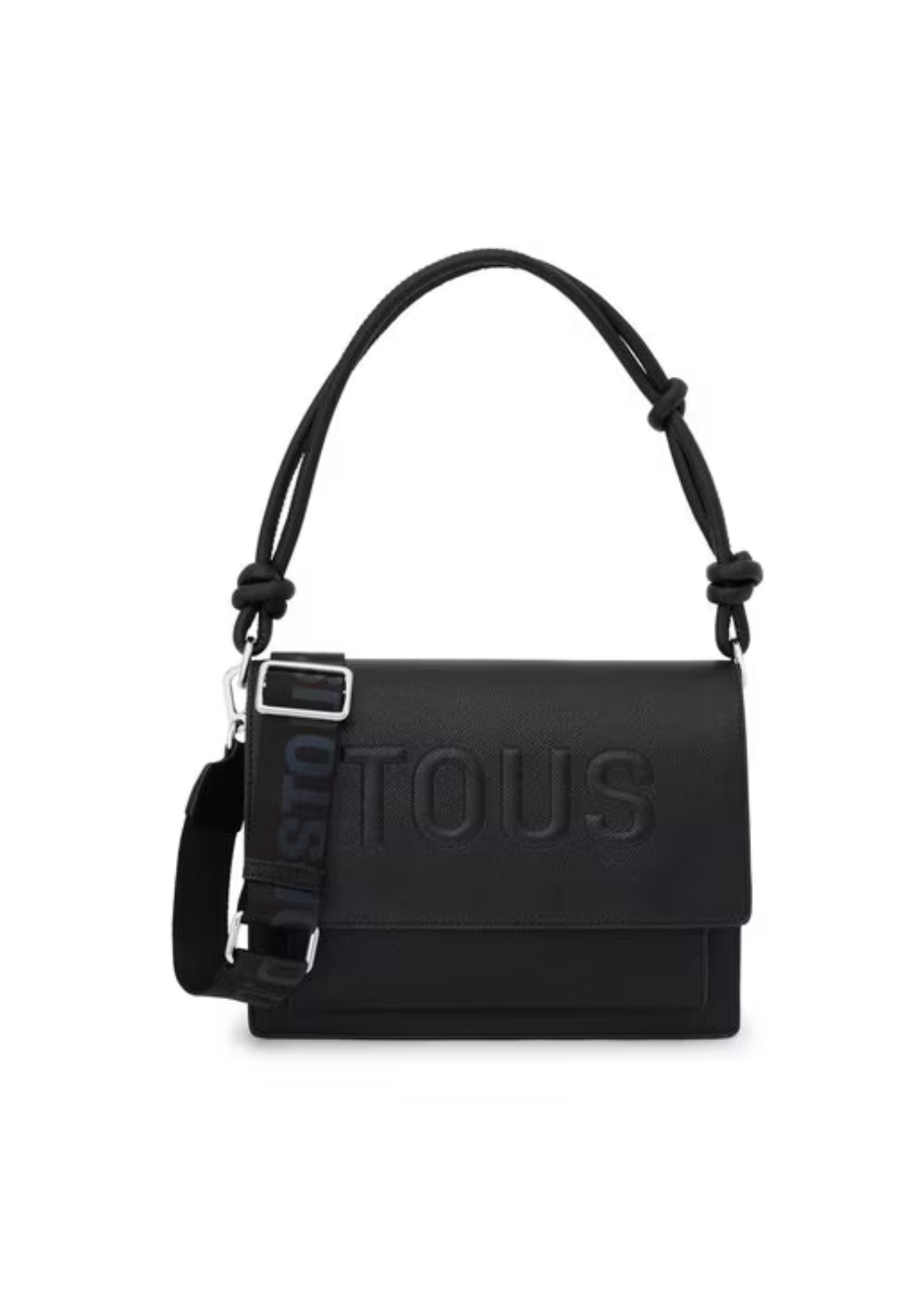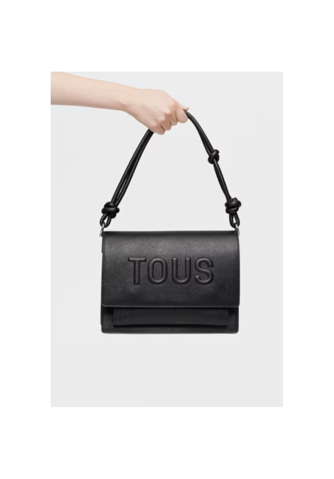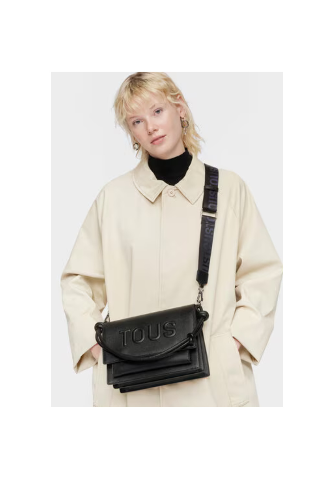 Bolso bandolera mediano Audree TOUS La Rue New de poliuretano. Incorpora una solapa y cierre con dos botones magnéticos. Cuenta con dos compartimentos separados por uno con cremallera y un bolsillo abierto en la parte delantera. Asa de hombro fija y asa bandolera ajustable y extraíble.