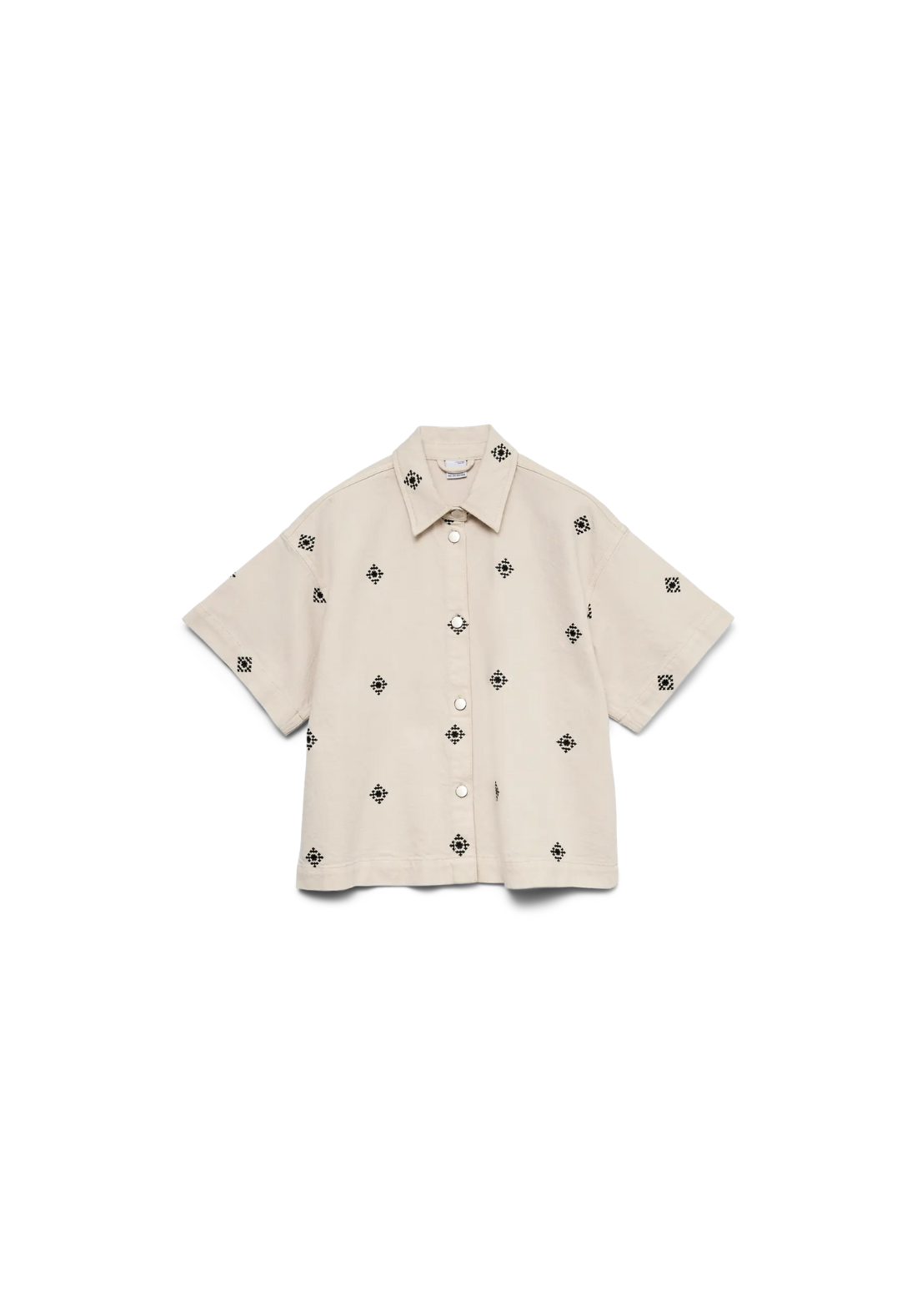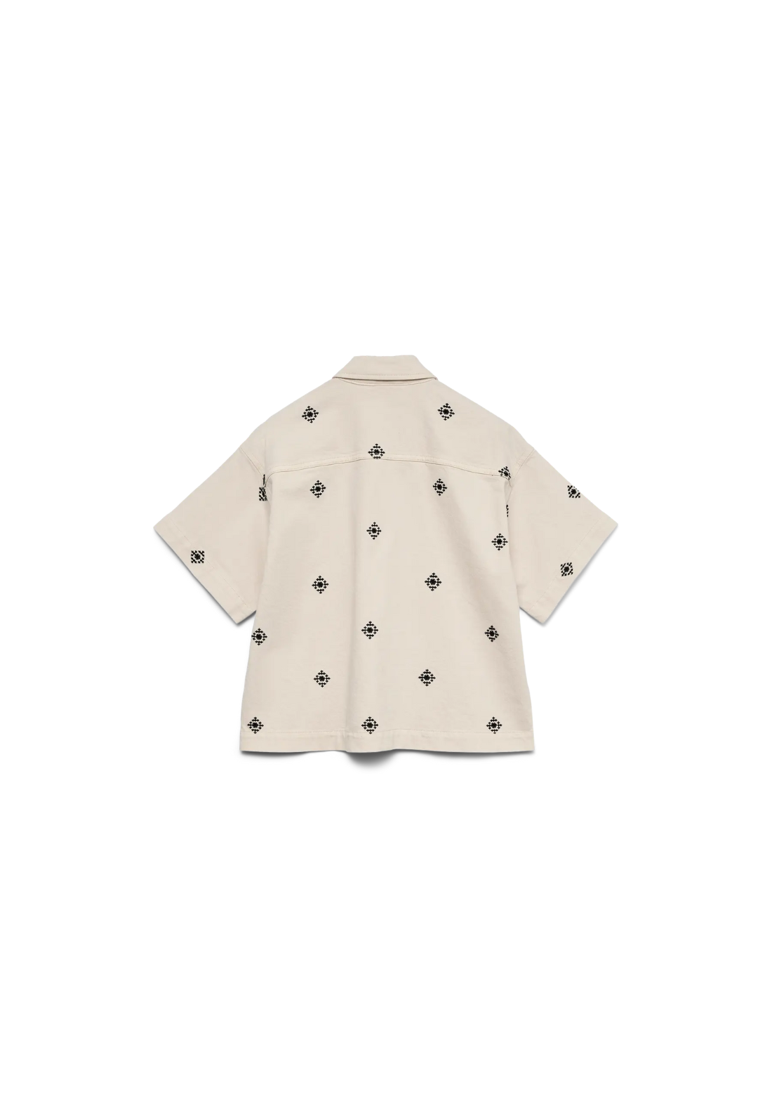 Camisa vaquera, manga 2/4, cuello de camisa y hombros caídos. Cierre de botones.