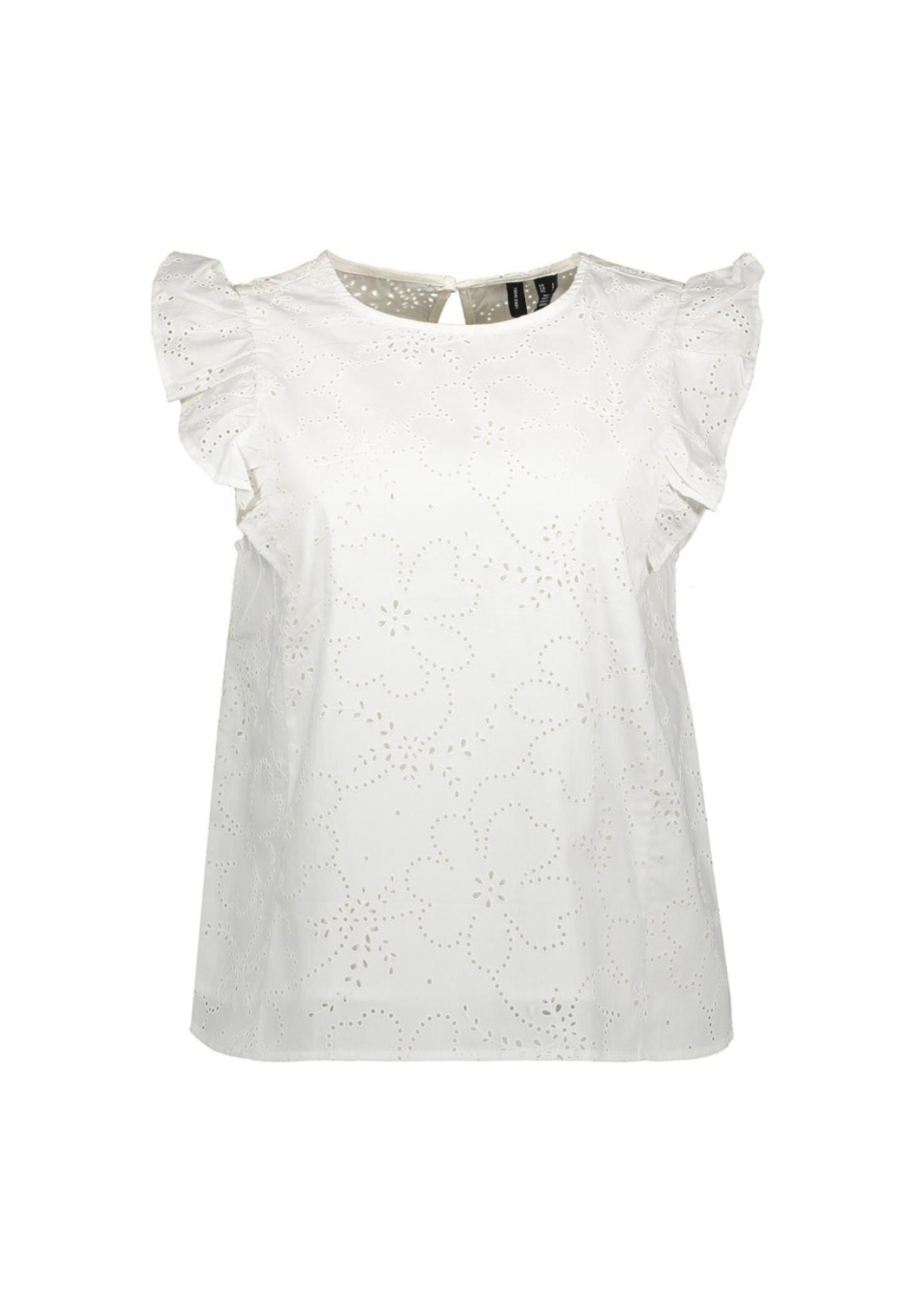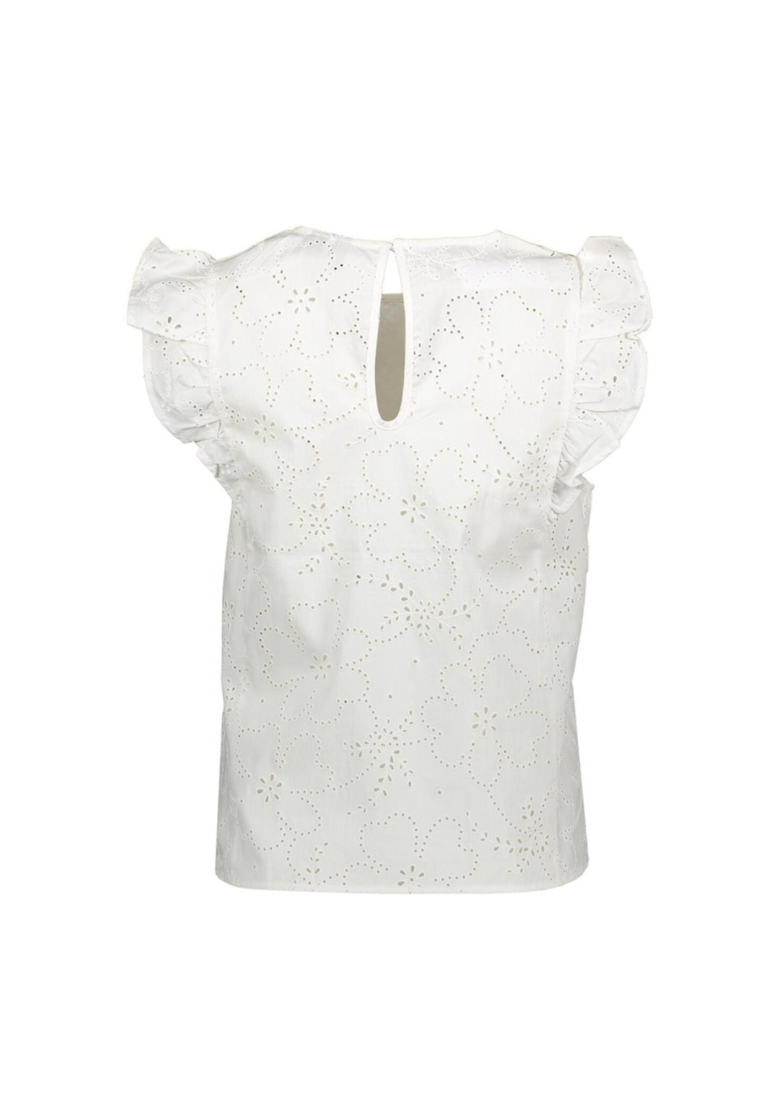 Top sin mangas, calado, de cuello redondo. El cierre es con un botón en la parte trasera.