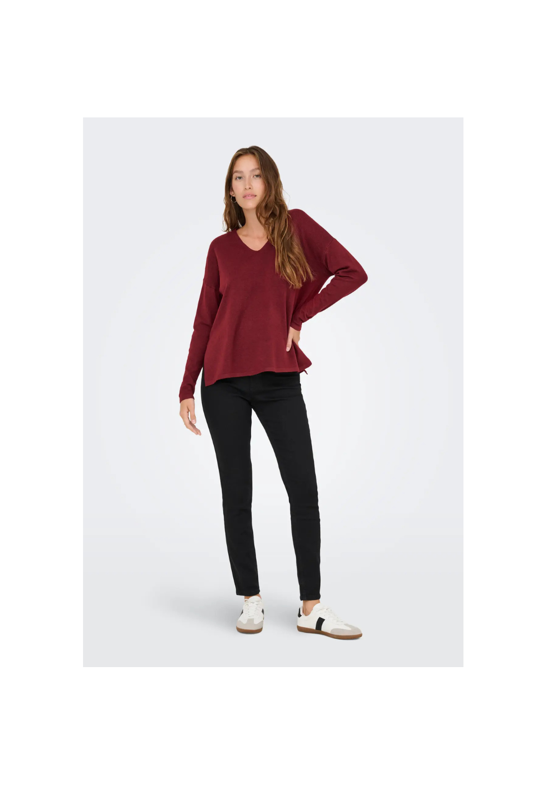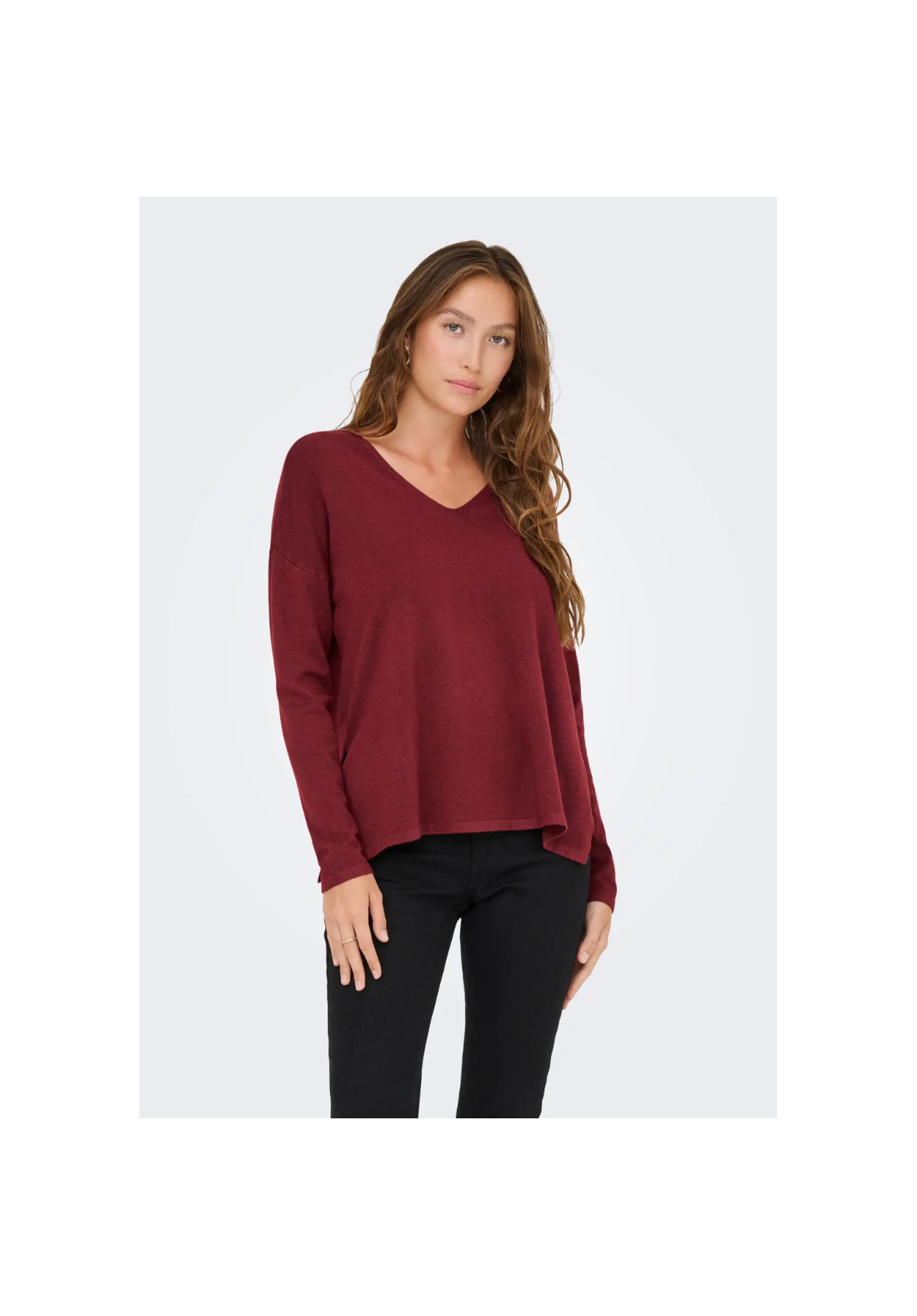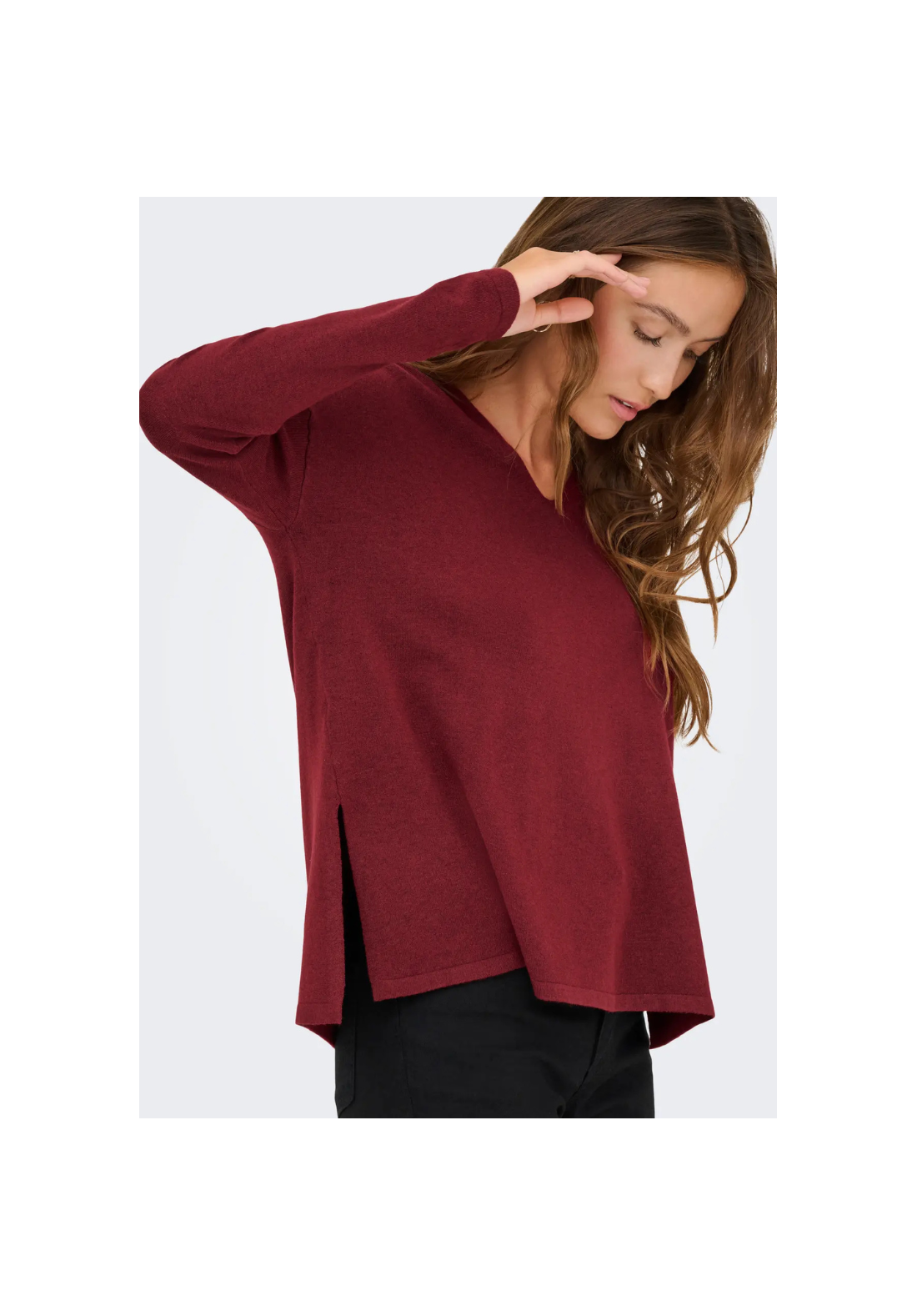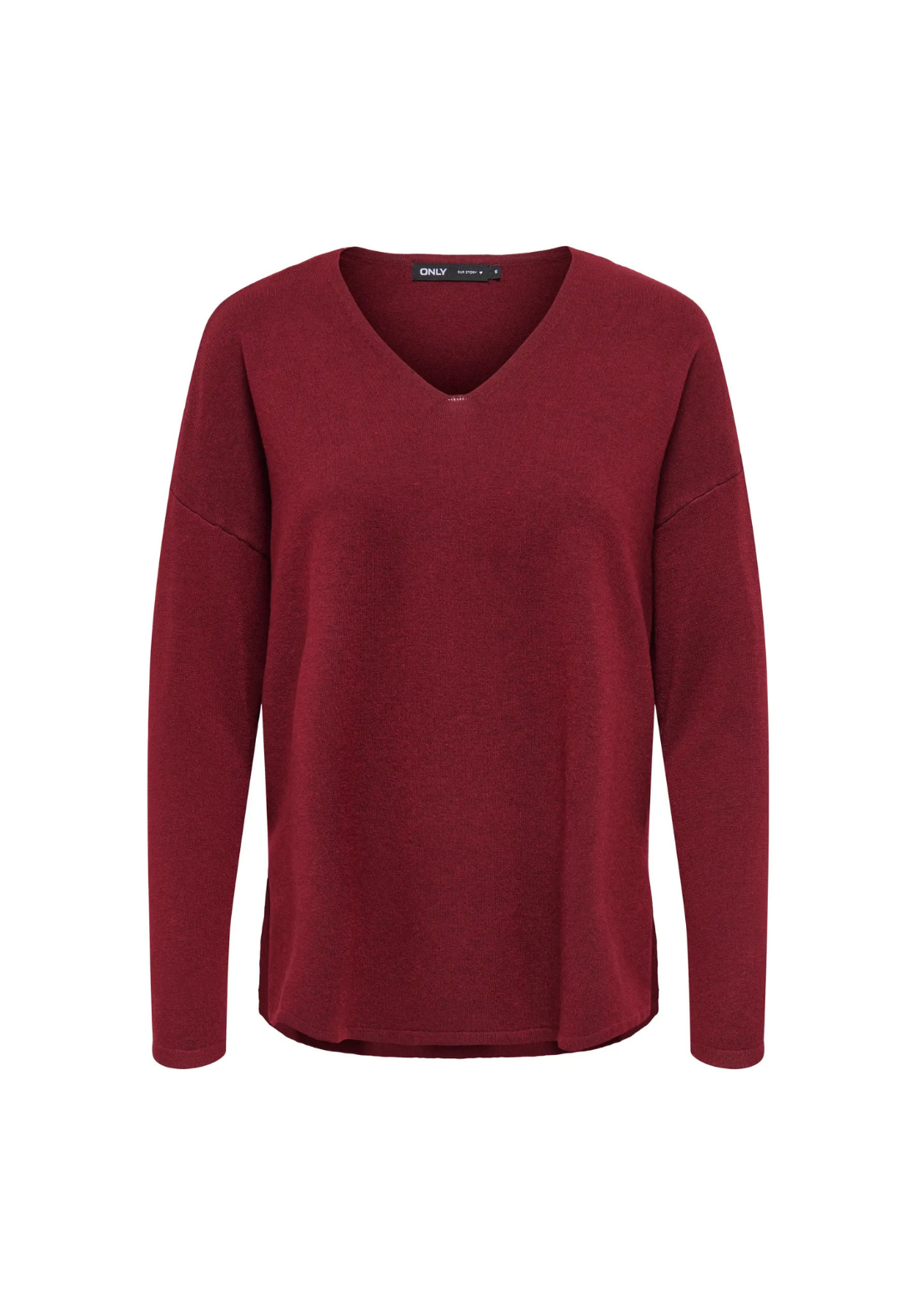 Jersey de punto, de manga larga, con cuello en V. Tiene los hombros caídos y los puños acanalados.
