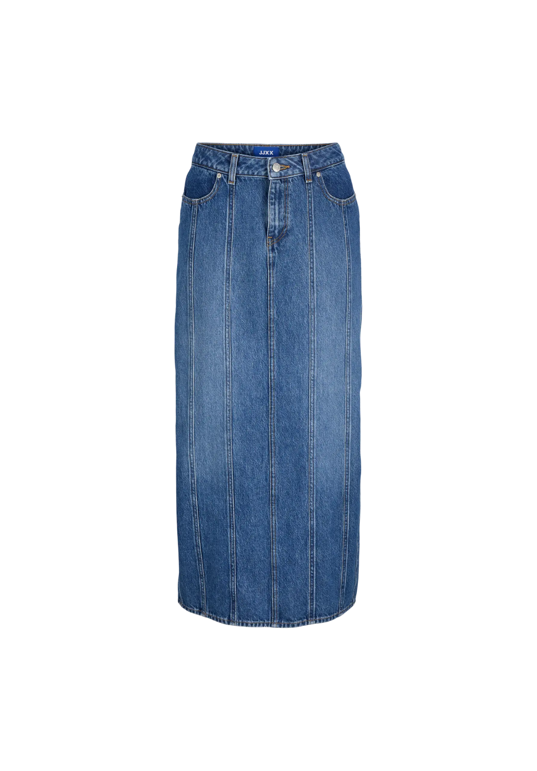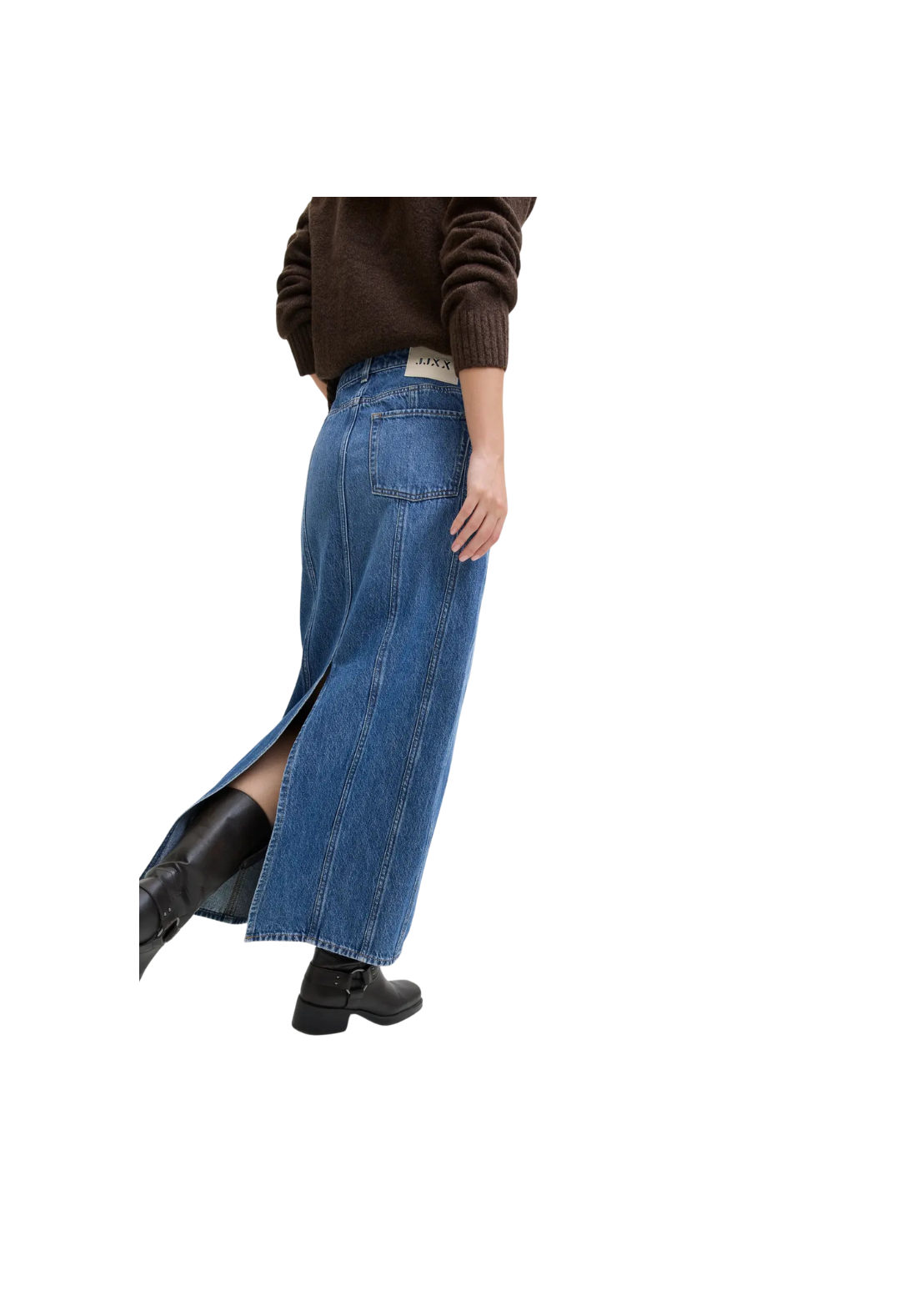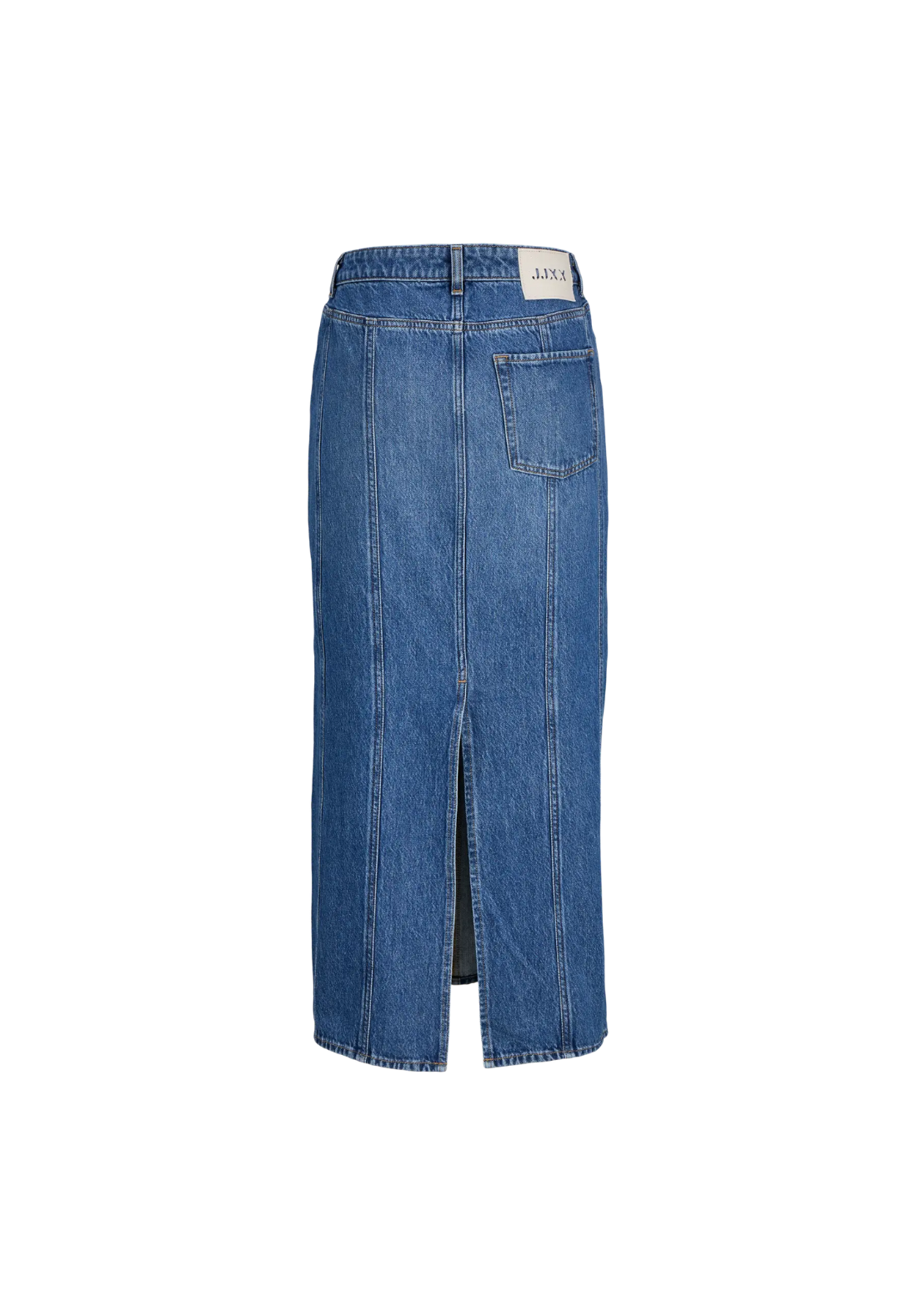 Falda vaquera, con cierre de botón y cremallera. Tiene bolsillos delanteros y un bolsillo trasero. Es de cintura media y el largo es maxi. Tiene líneas de corte y una abertura pronunciada en la parte trasera.