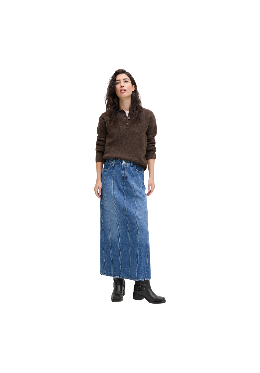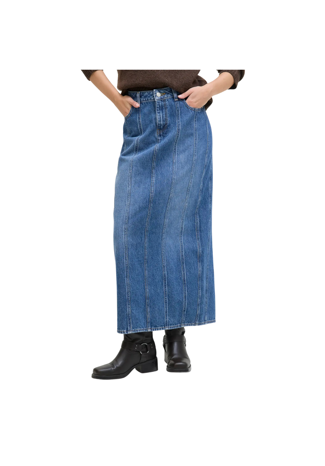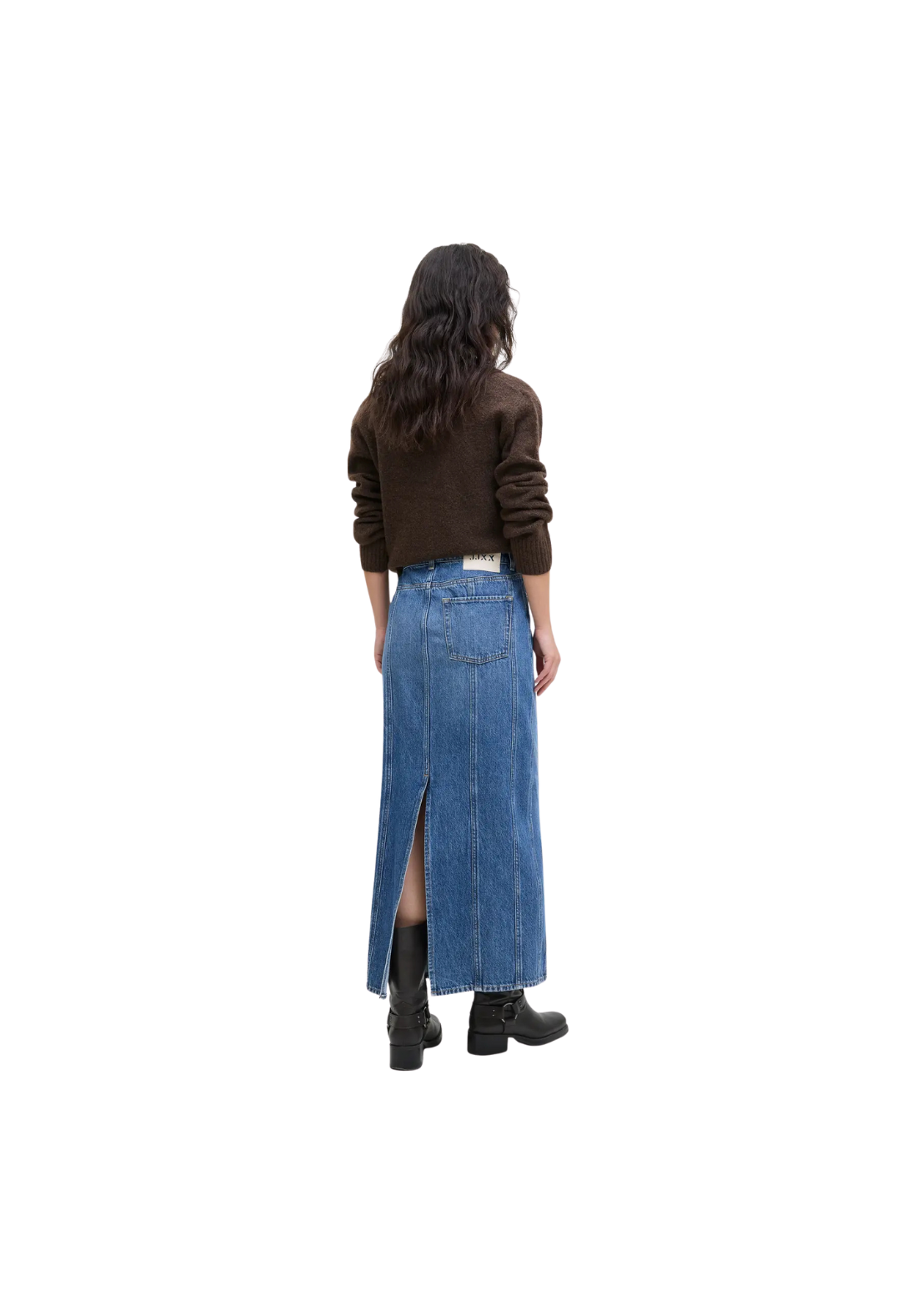 Falda vaquera, con cierre de botón y cremallera. Tiene bolsillos delanteros y un bolsillo trasero. Es de cintura media y el largo es maxi. Tiene líneas de corte y una abertura pronunciada en la parte trasera.