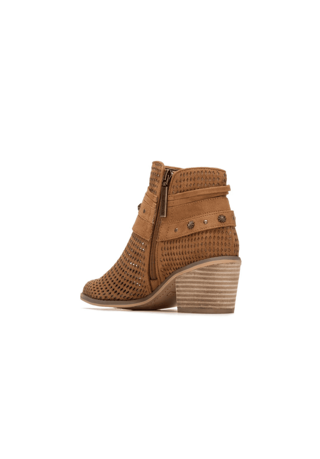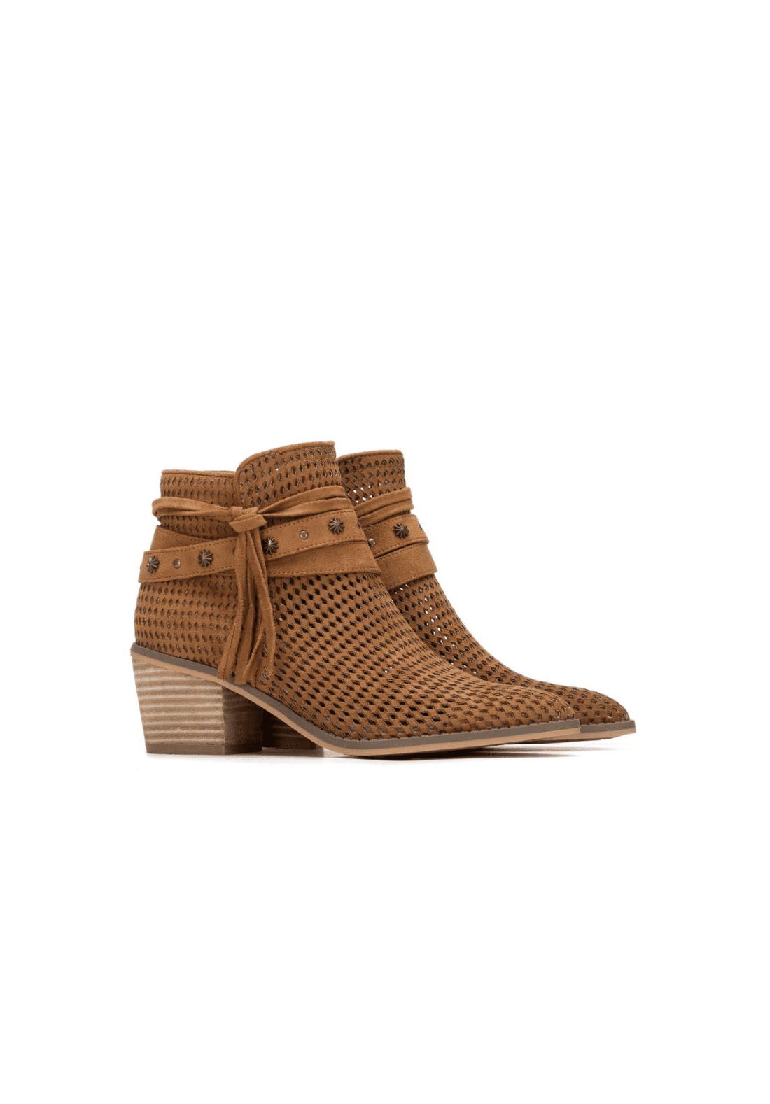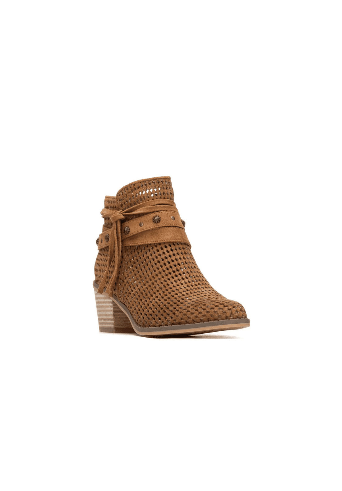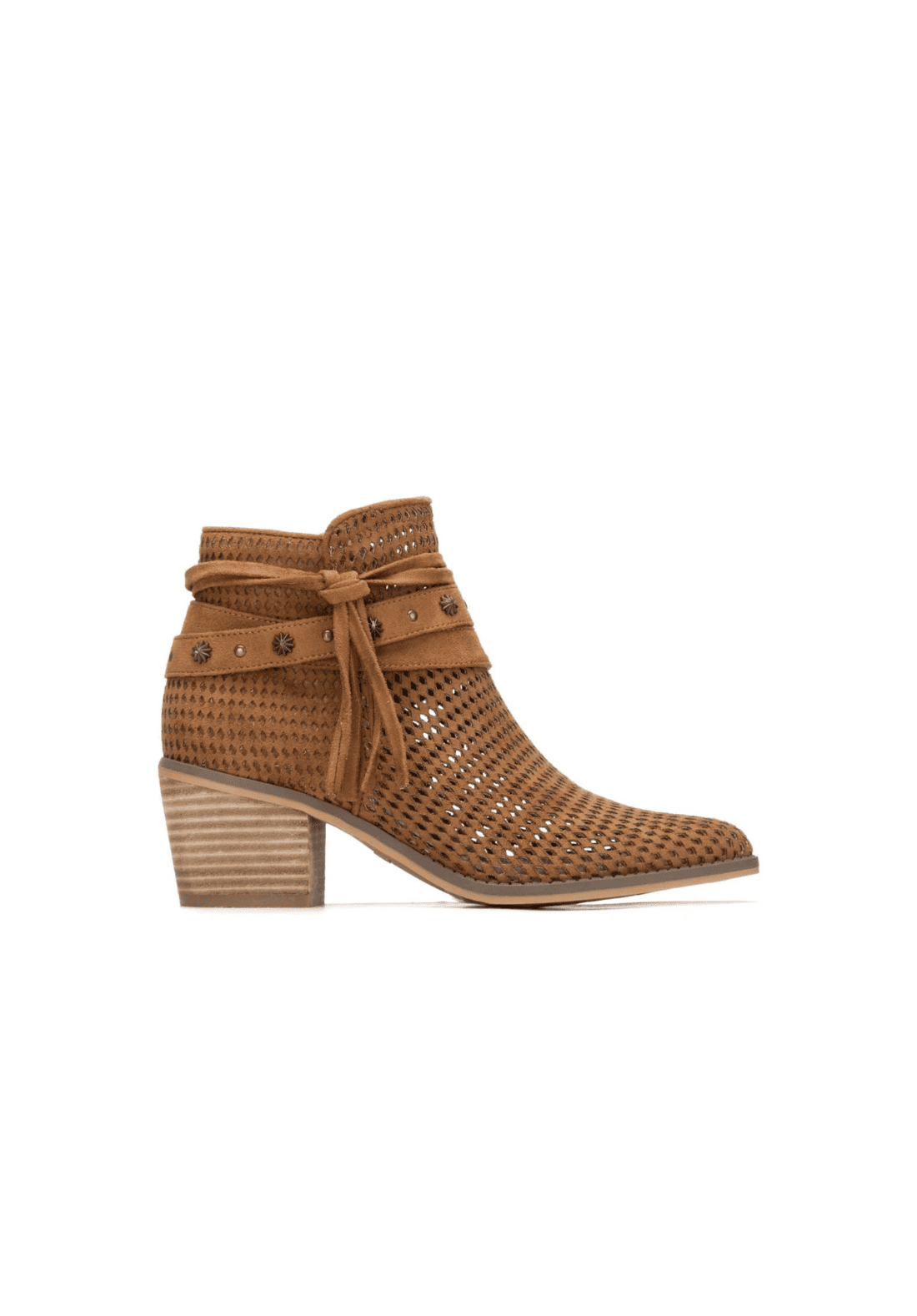 Botín de mujer, marca Refresh. Fabricado en antelina. Con detalles decorativos en el tobillo, una cinta con aplicación de tachas y lazo lateral,  estilo boho y moderno. Su tacón de bloque ofrece estabilidad y confort, ideal para uso diario o looks casuales. Este modelo ha obtenido el certificado vegano por la organización mundial PETA (Organización de los derechos de los animales).